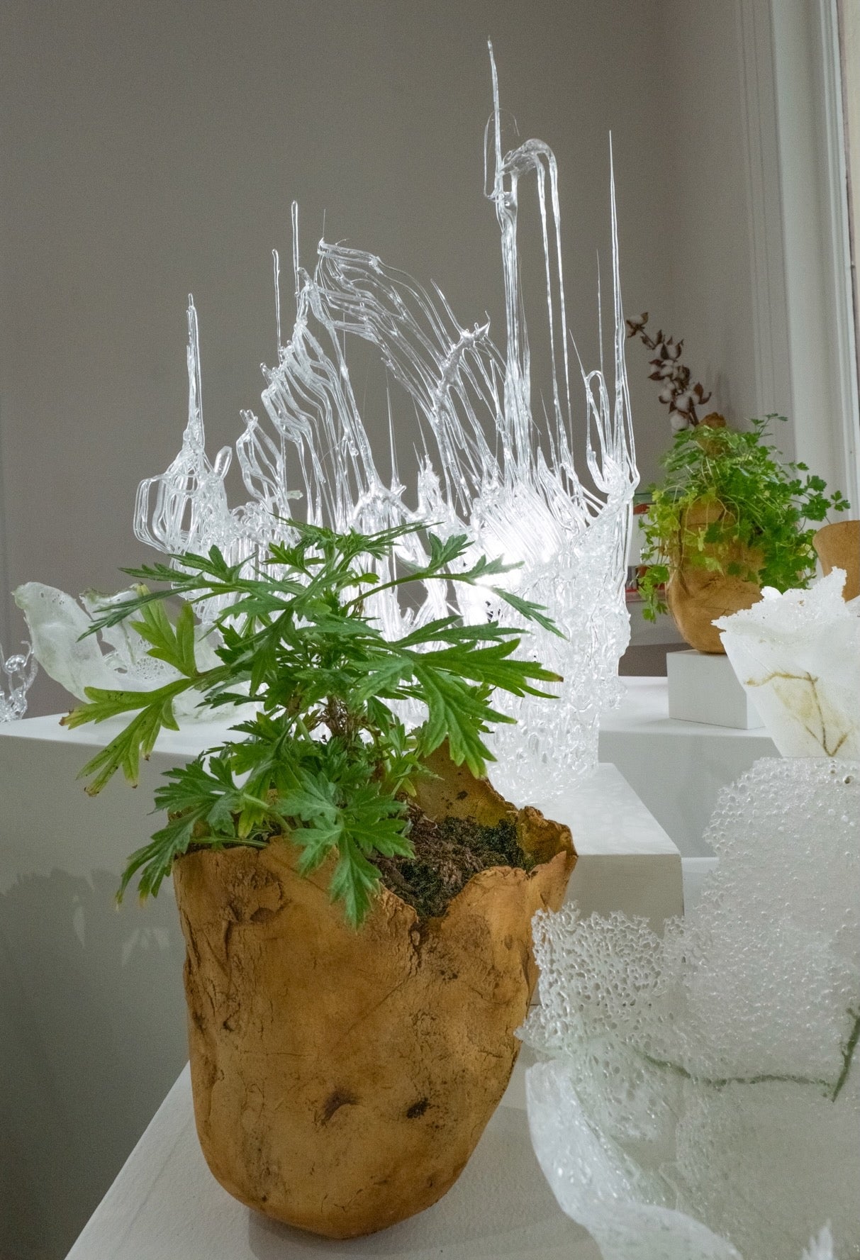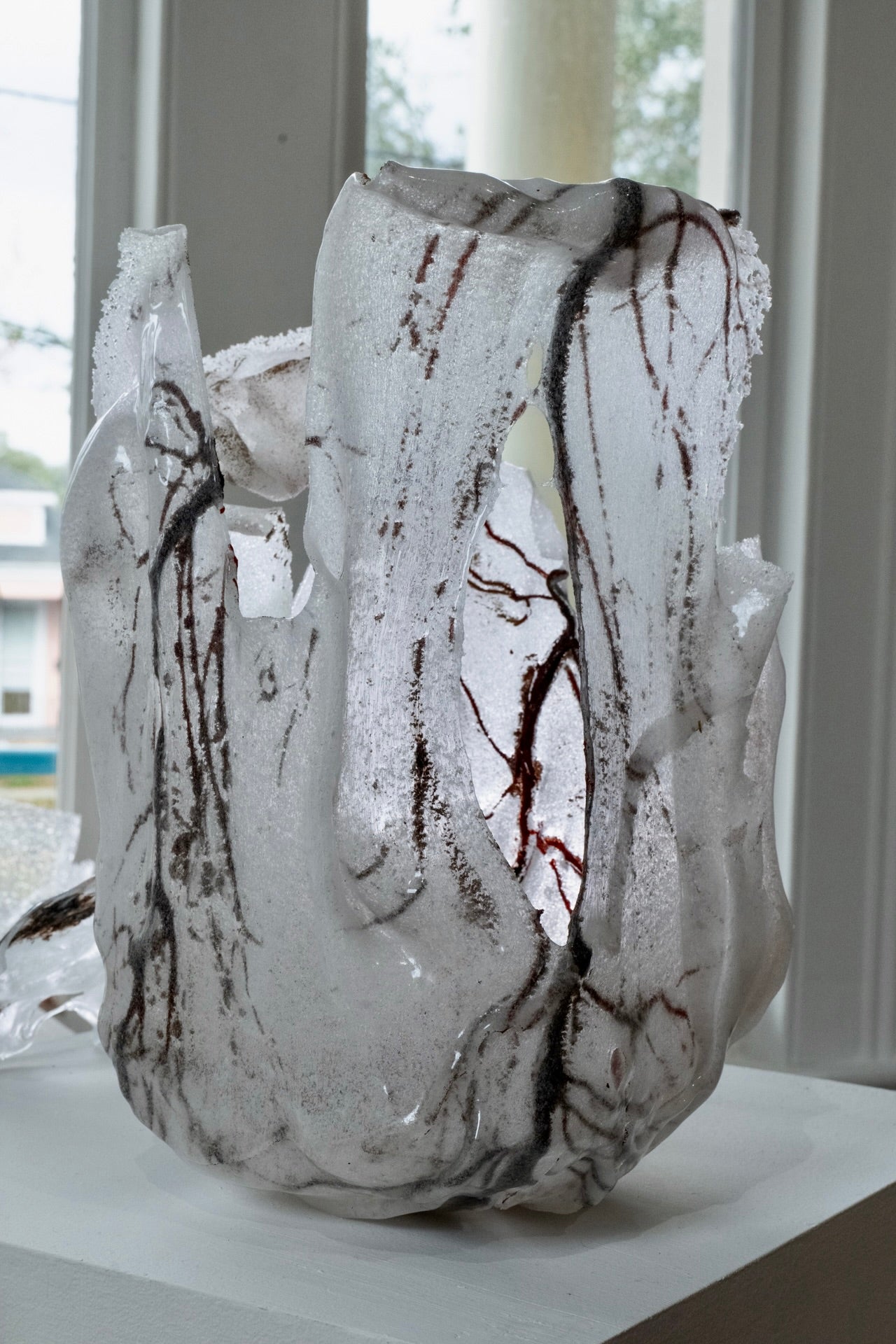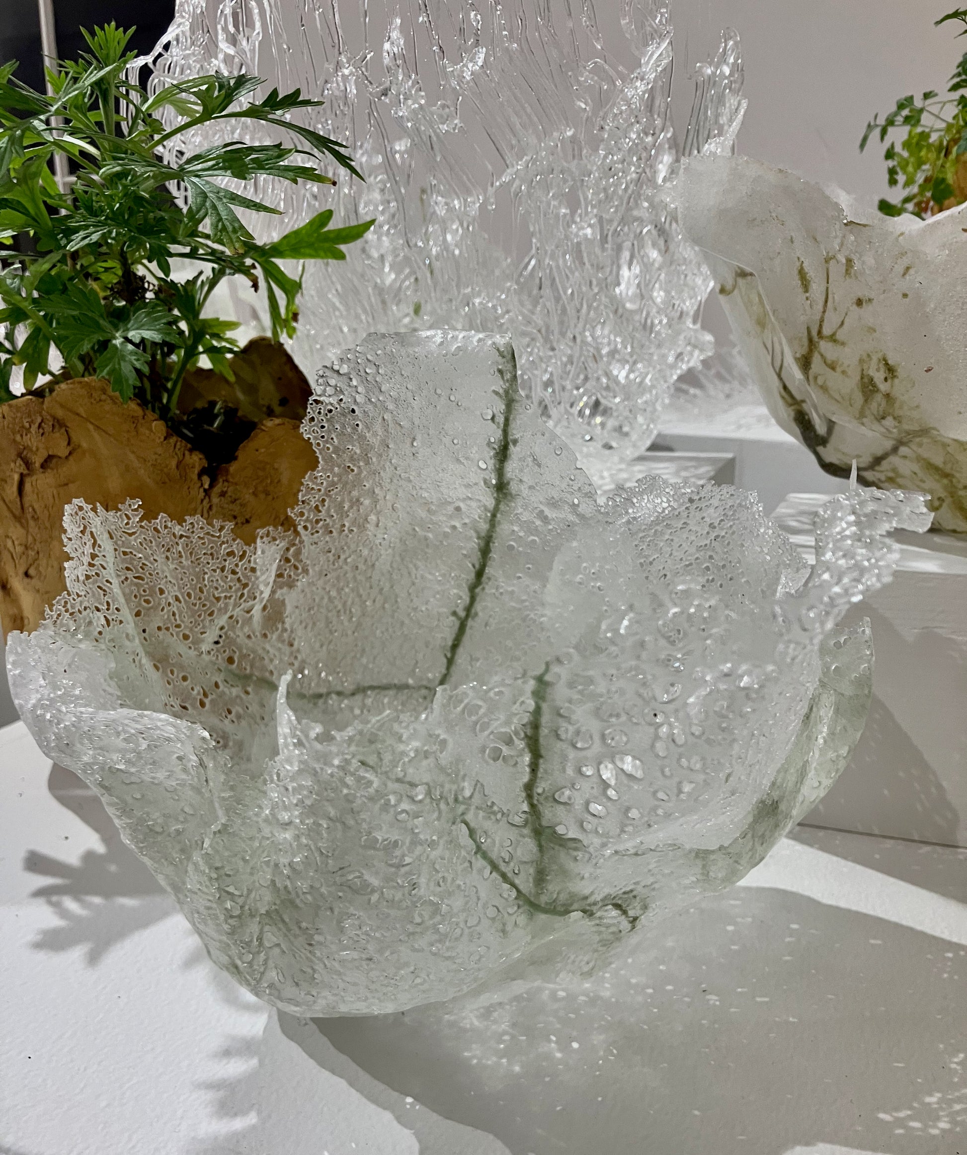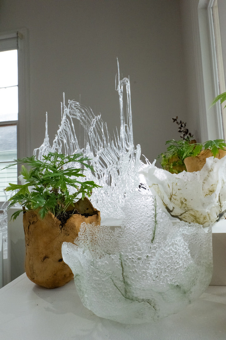 The vessels in this series were made by kiln-forming woven glass cane or frit de verre botanical prints made from the plants referenced in my community partner's research. Frit de Verre refers to the process of making objects out of glass powder without the use of a liquid binder— pate de verre, which is a more common term, uses a binder to form the powder before it is kiln fired. To make these, I harvest plants and press them into clay slabs while still fresh. Then I make a positive from the clay using either wax or alginate, and then a plaster-silica mold from the positive. When the plaster is cured, I sift glass powder over the mold and fire it in a kiln. I often fire the glass a second or third time and manipulate it while it's at top temperature to create form.