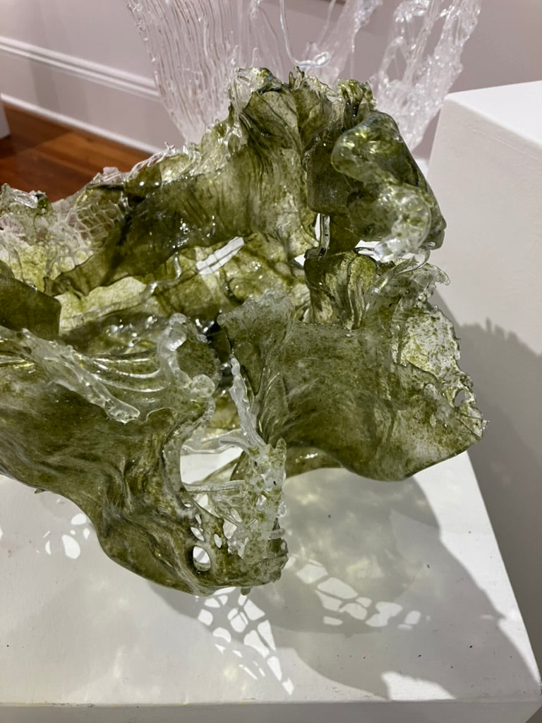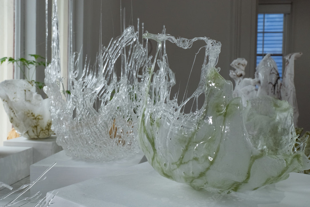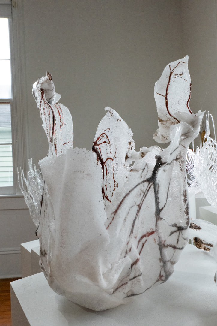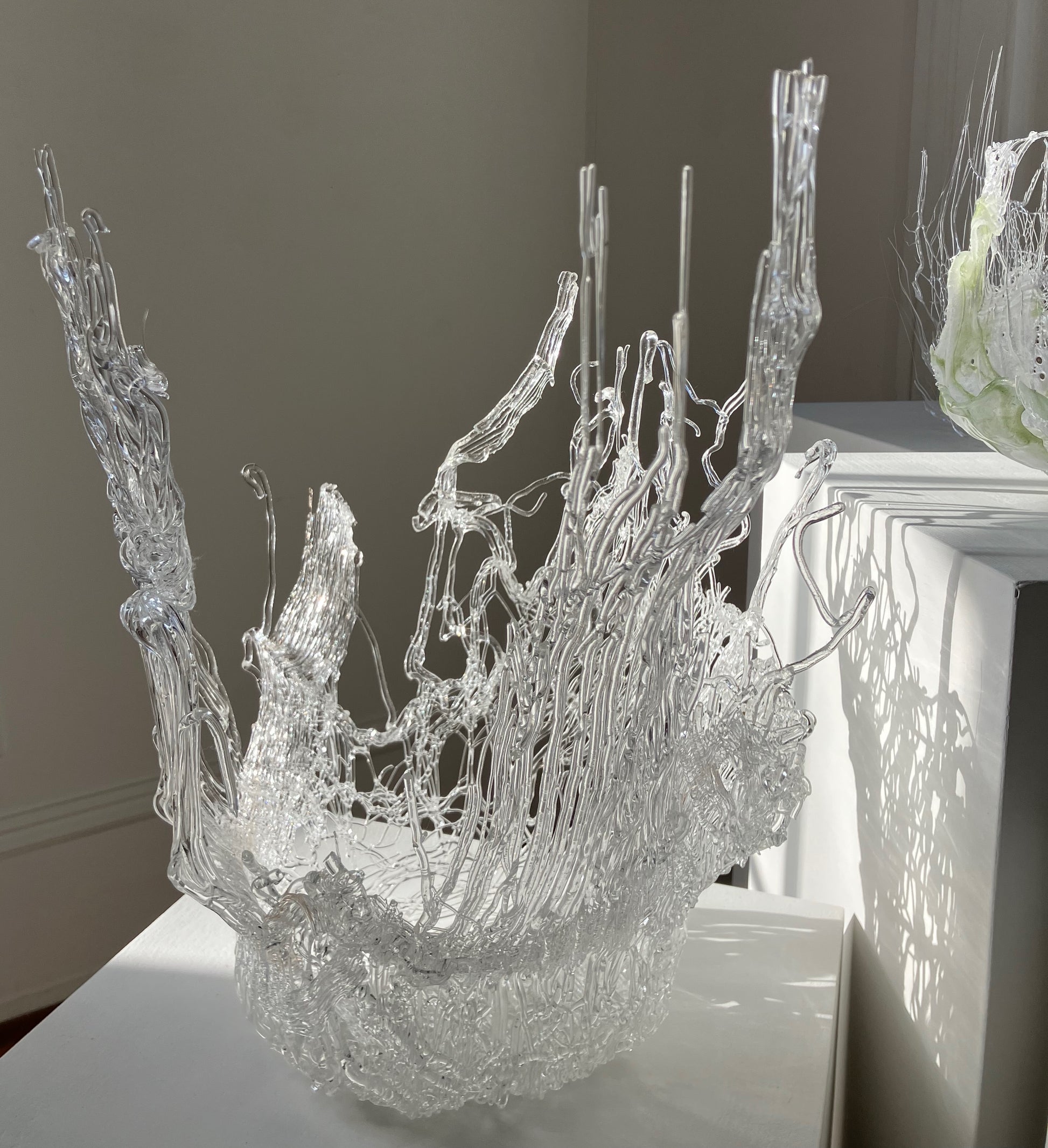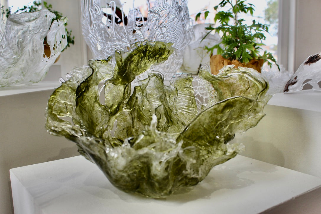 The vessels in this series were made by kiln-forming woven glass cane or frit de verre botanical prints made from the plants referenced in my community partner's research. Frit de Verre refers to the process of making objects out of glass powder without the use of a liquid binder— pate de verre, which is a more common term, uses a binder to form the powder before it is kiln fired. To make these, I harvest plants and press them into clay slabs while still fresh. Then I make a positive from the clay using either wax or alginate, and then a plaster-silica mold from the positive. When the plaster is cured, I sift glass powder over the mold and fire it in a kiln. I often fire the glass a second or third time and manipulate it while it's at top temperature to create form.
