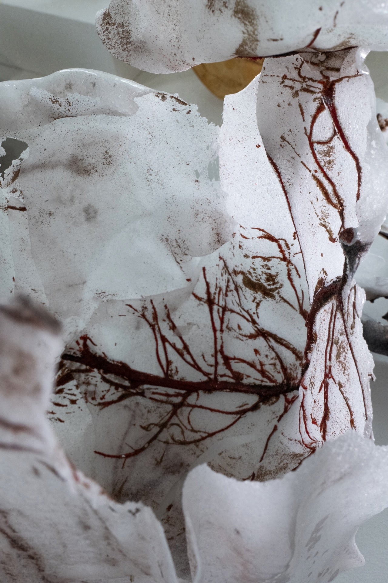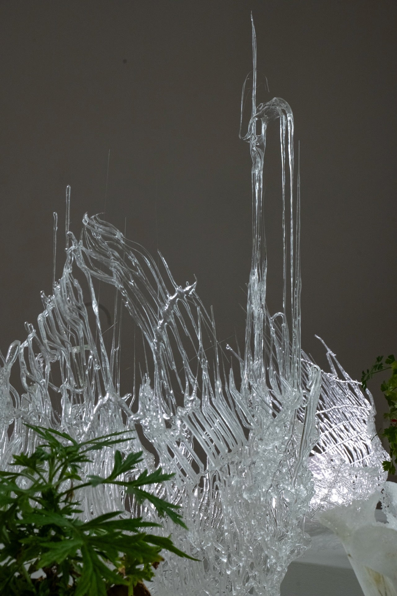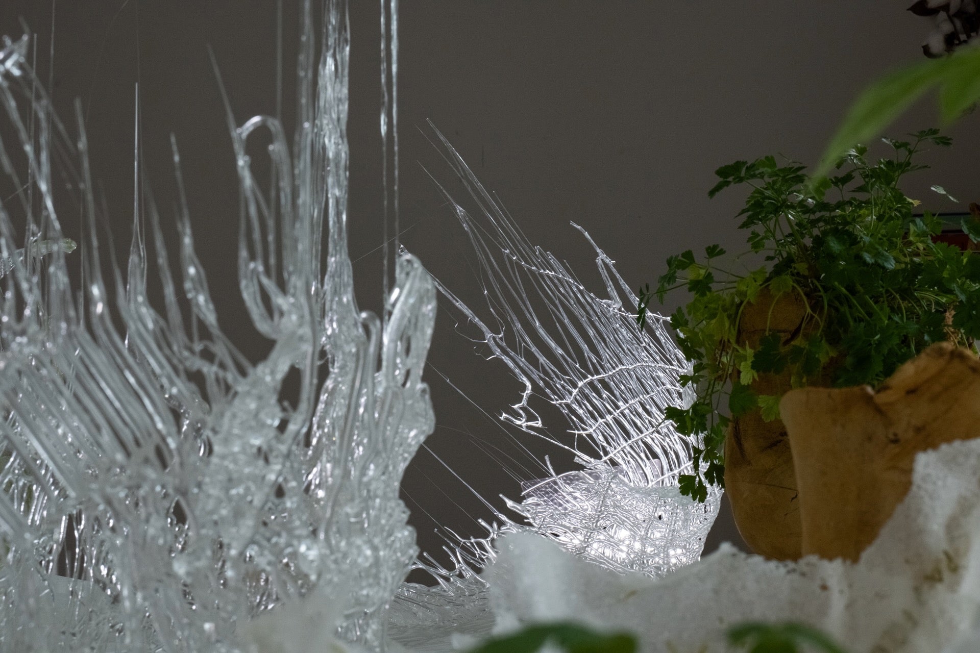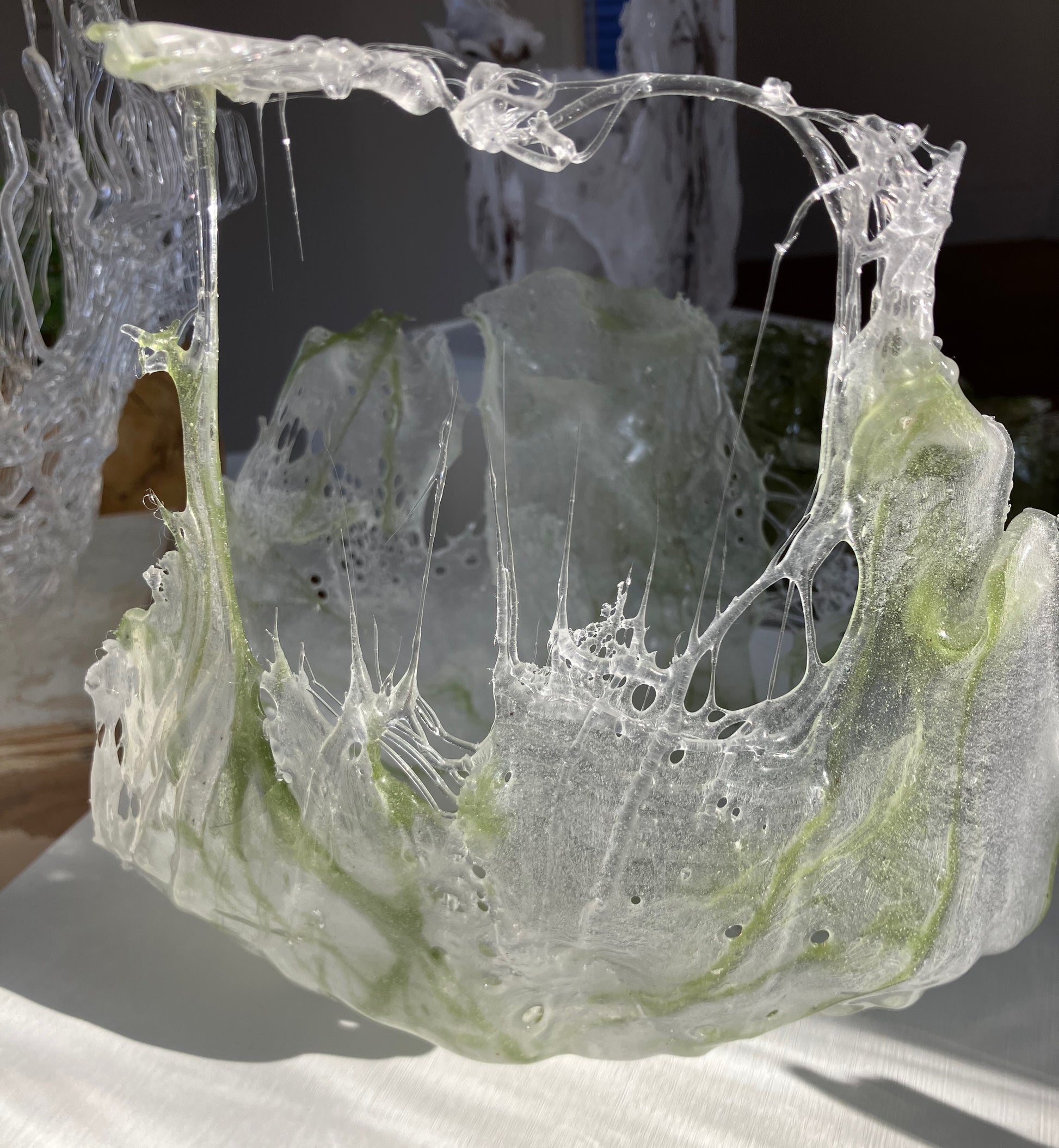 The vessels in this series were made by kiln-forming woven glass cane or frit de verre botanical prints made from the plants referenced in my community partner's research. Frit de Verre refers to the process of making objects out of glass powder without the use of a liquid binder— pate de verre, which is a more common term, uses a binder to form the powder before it is kiln fired. To make these, I harvest plants and press them into clay slabs while still fresh. Then I make a positive from the clay using either wax or alginate, and then a plaster-silica mold from the positive. When the plaster is cured, I sift glass powder over the mold and fire it in a kiln. I often fire the glass a second or third time and manipulate it while it's at top temperature to create form.
