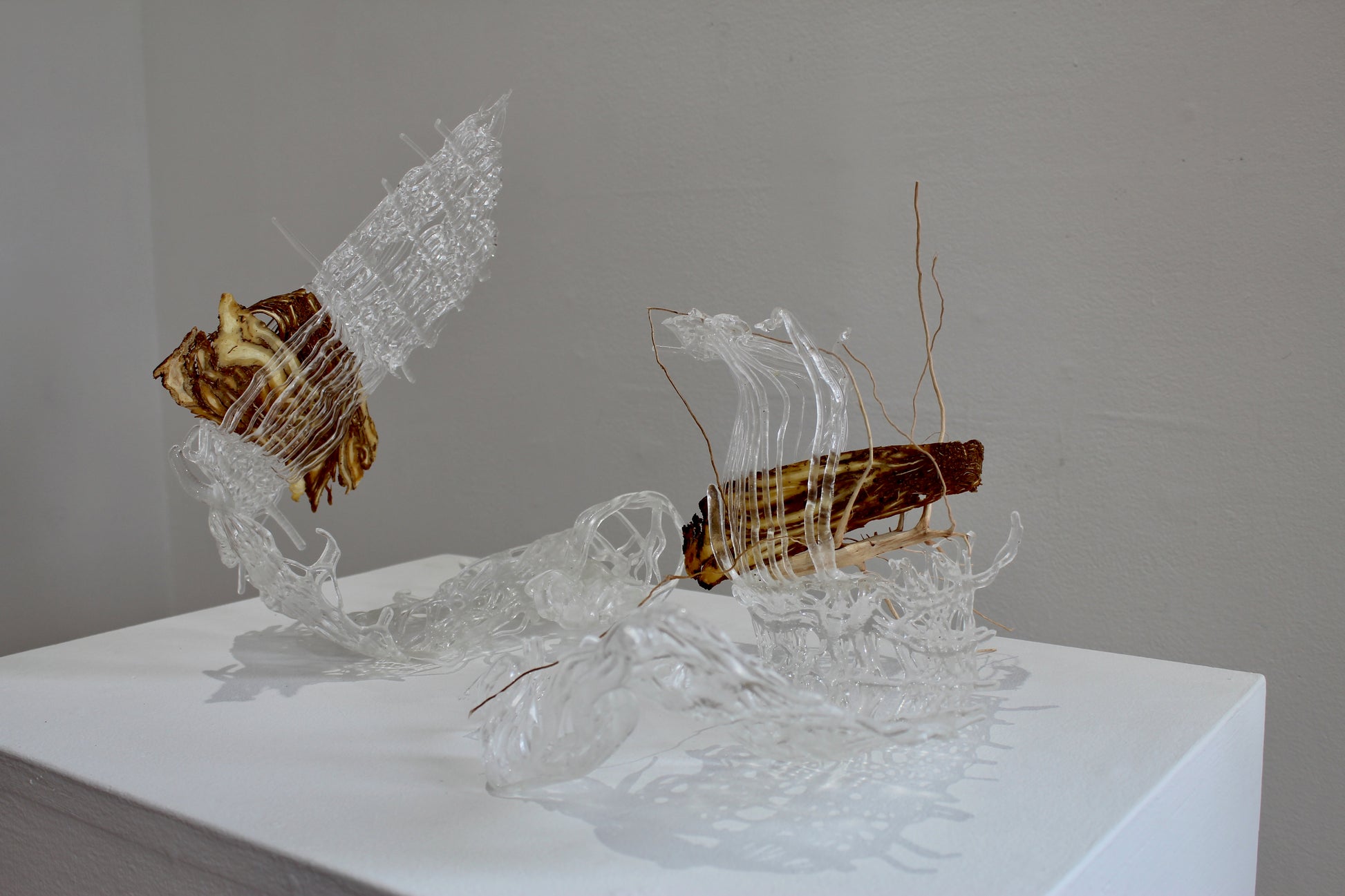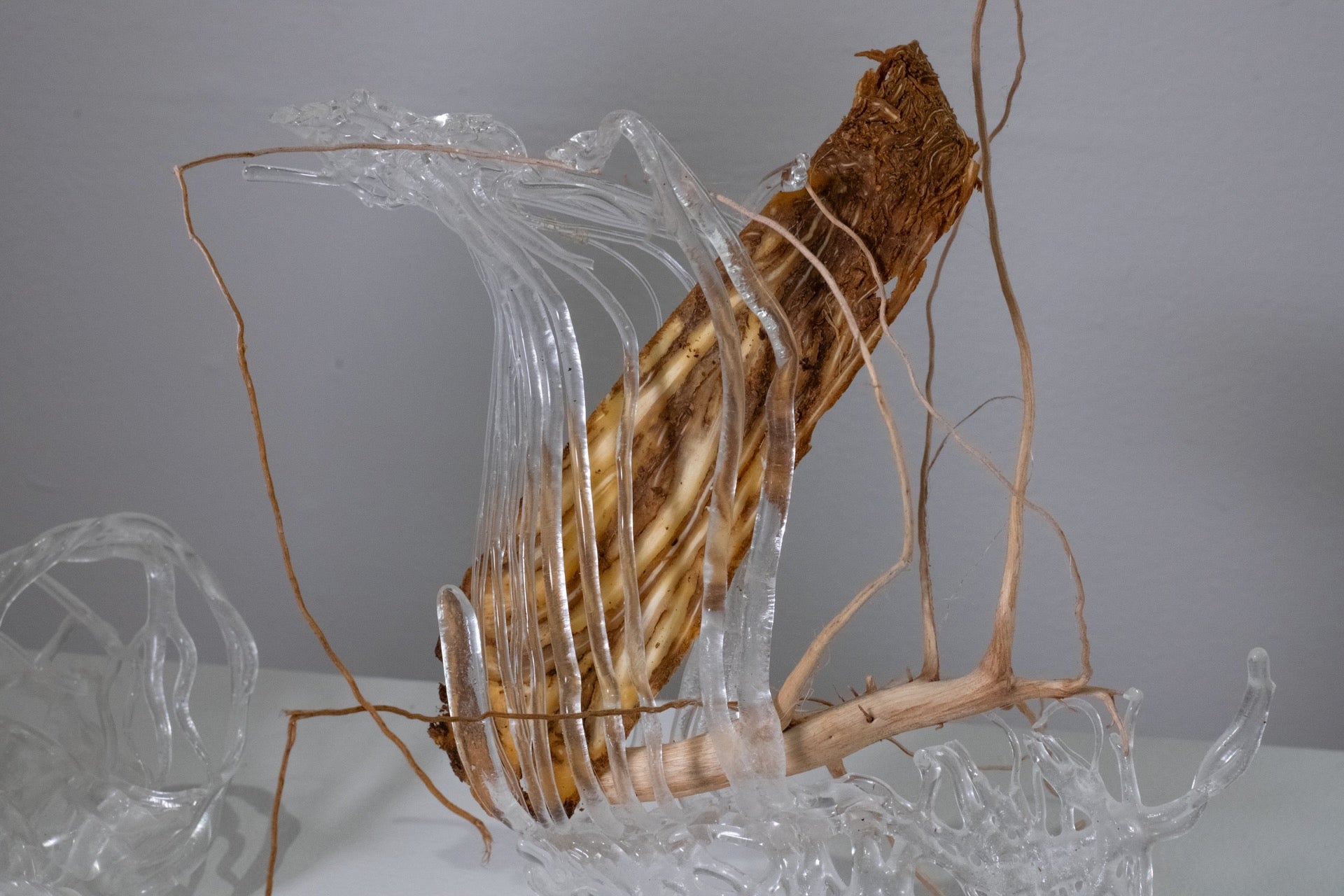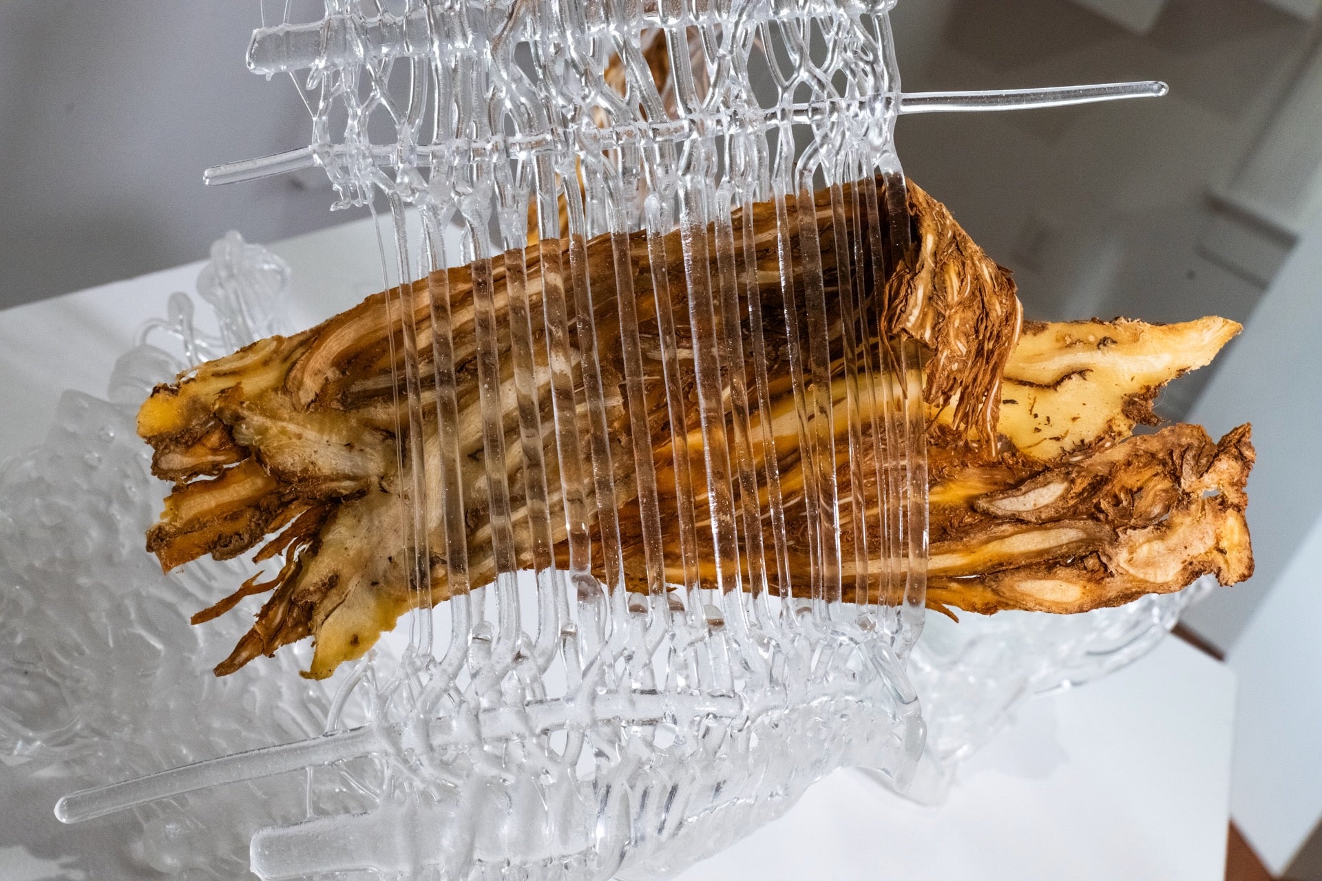 hand-pulled glass cane, kiln woven and formed, Angelica spp. root, Gossypium herbaceum root