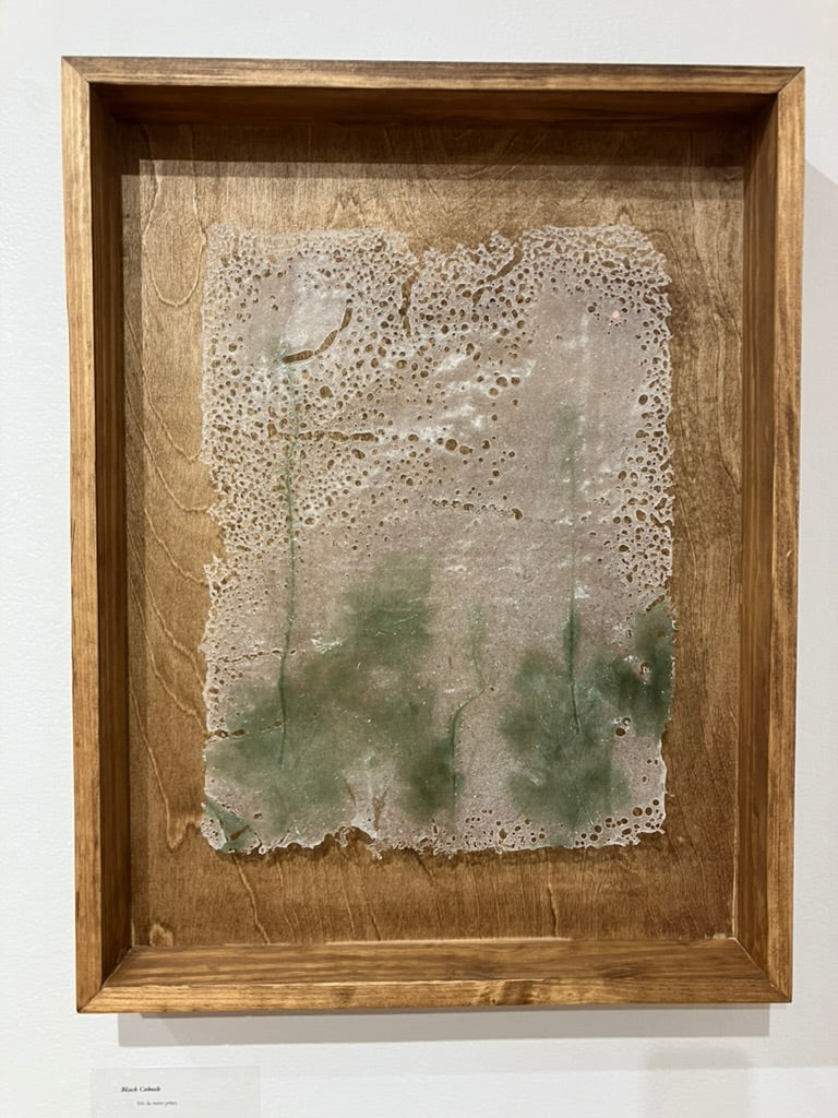 Like all of the plants referenced in this exhibition, Black Cohosh is an ally of human reproductive agency. To make this glass print, Black Cohosh was pressed into clay. A wax positive is made from the clay, and a plaster-silica mold is made from the wax. Glass powder was kiln-fused over the plaster-silica molds, then the glass ‘prints’ were manipulated while hot in the kiln, an expression of human agency and intervention.