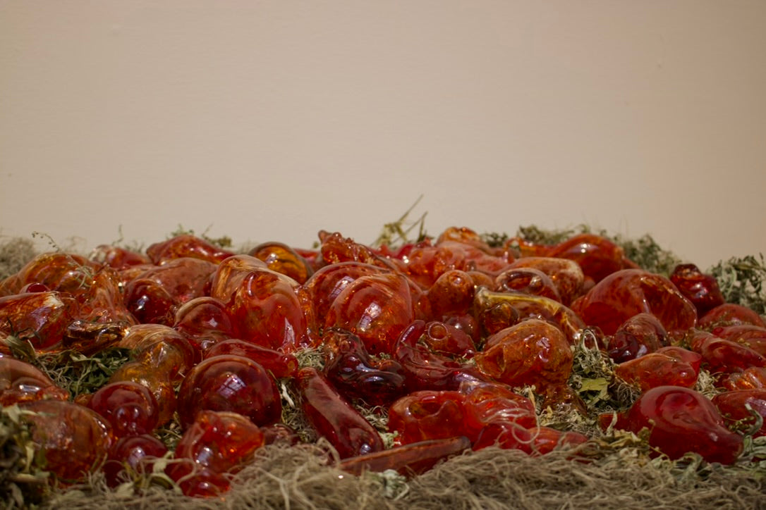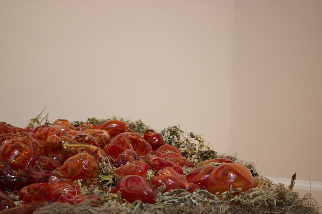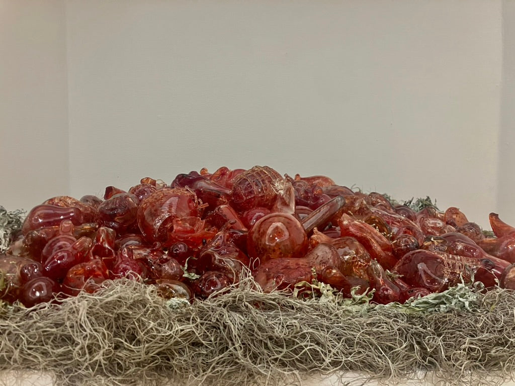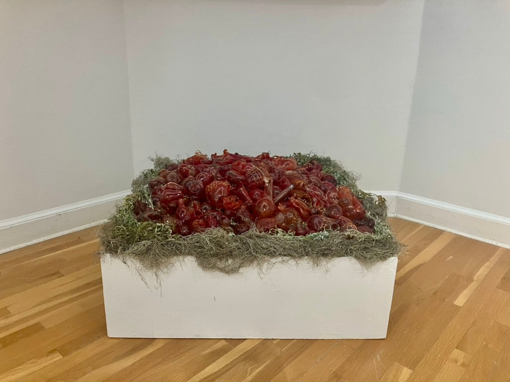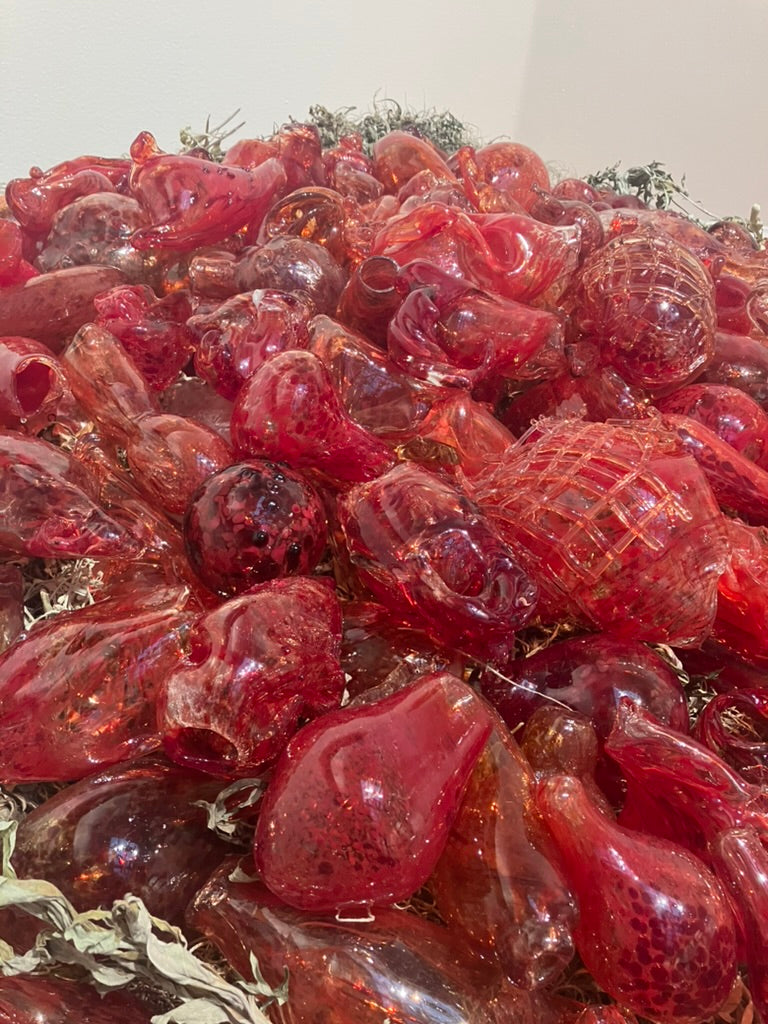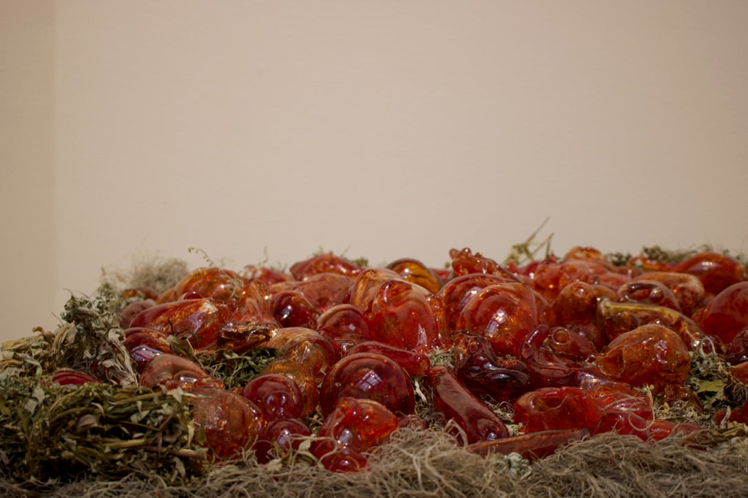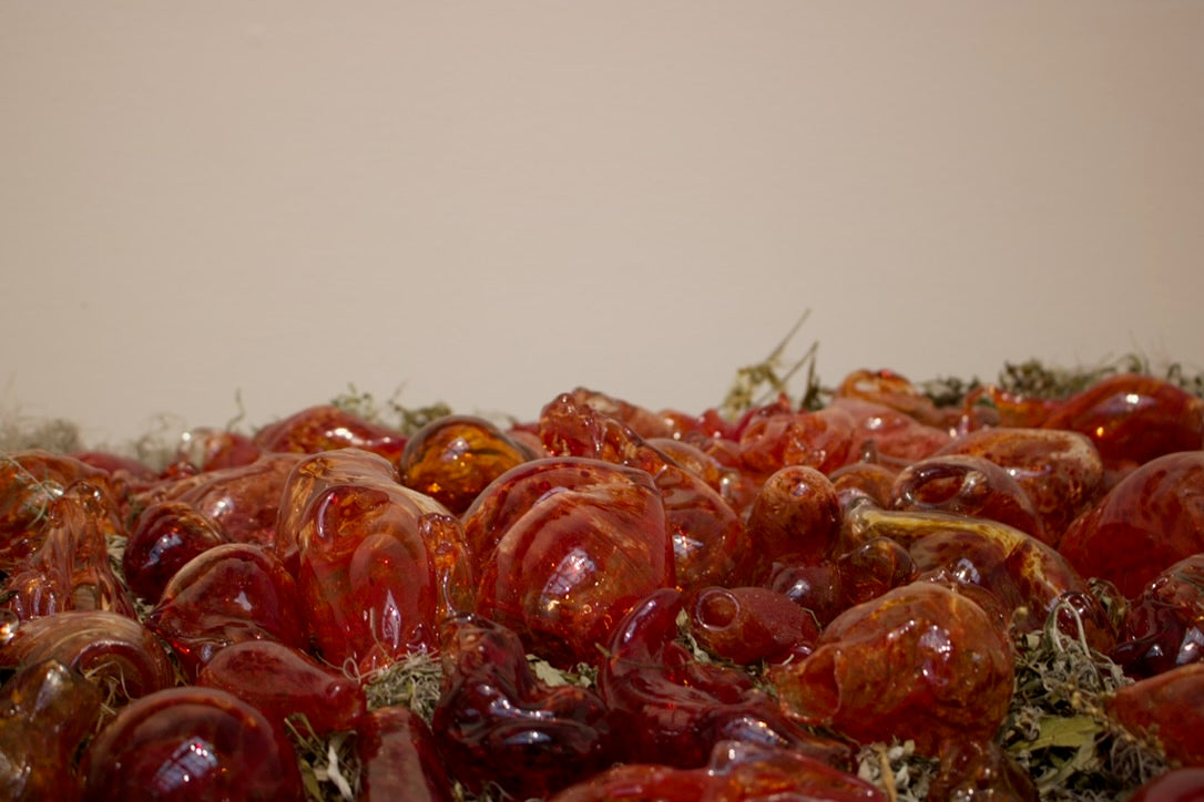 Carriage is a collection of 156 menstrual hued blown glass amphora piled up on Spanish moss, a traditional bedding material, and mugwort, an herb that induces vivid dreaming. When I make amphora I’m thinking about disposability, cosmetics, multiples; that which is transitory, like uteruses, unfertilized eggs, breath. The amphora evoke bottles for medicine, perfume, poison, makeup, remedies, oils, potions. They are surgical, sutured, fallopian tubes, boxes, shells, dendroids, clots, masses.