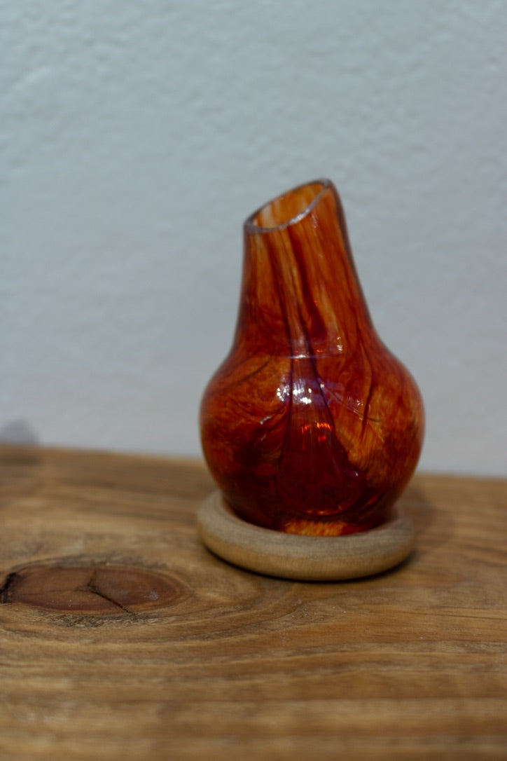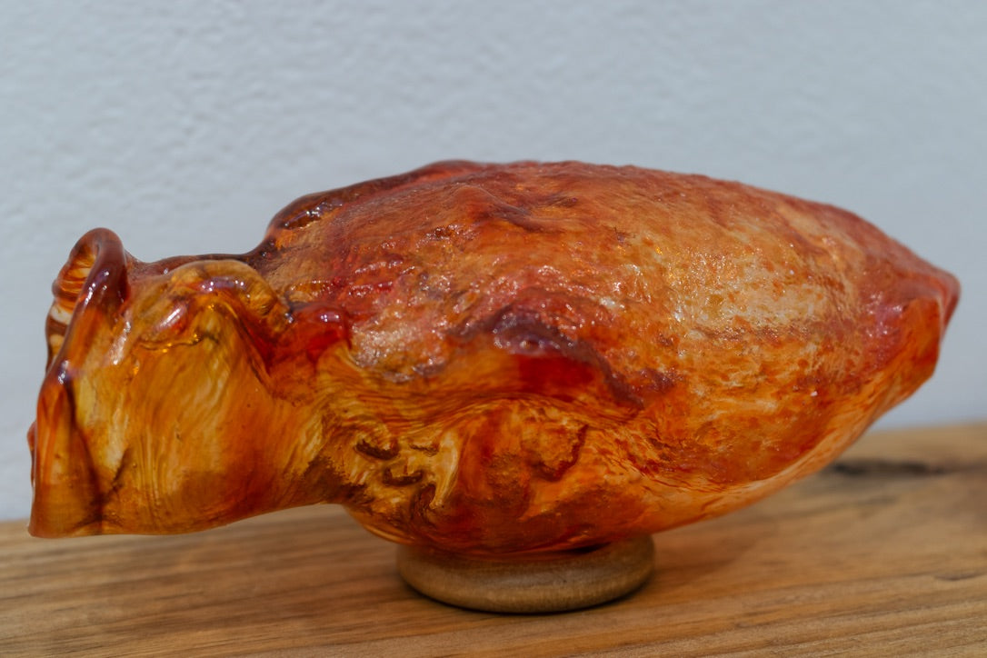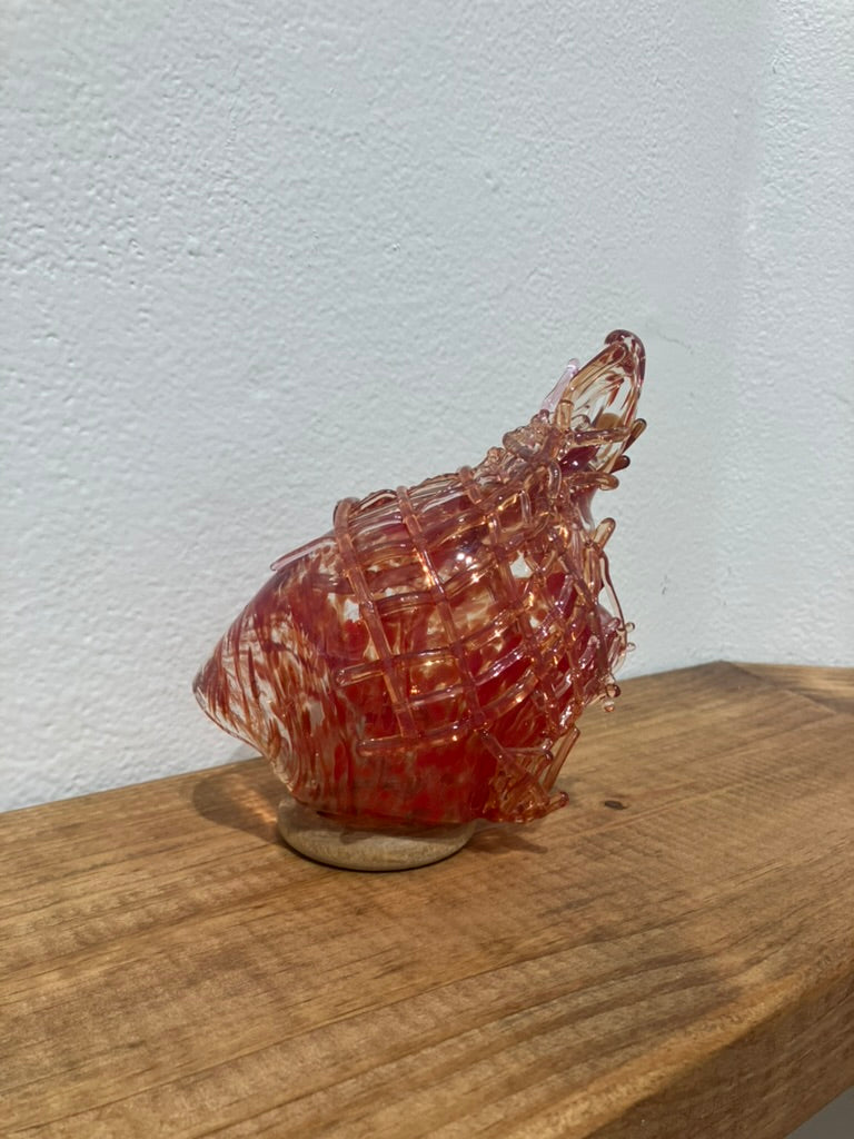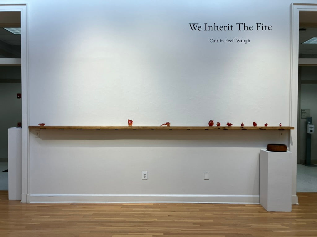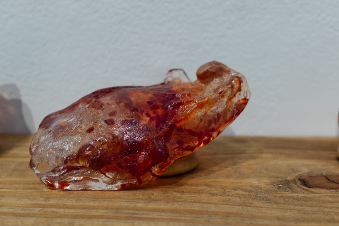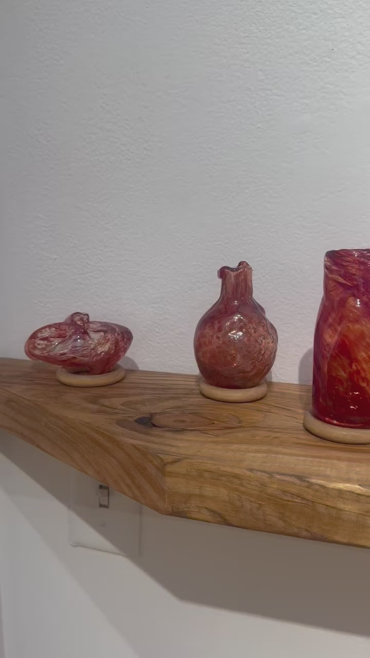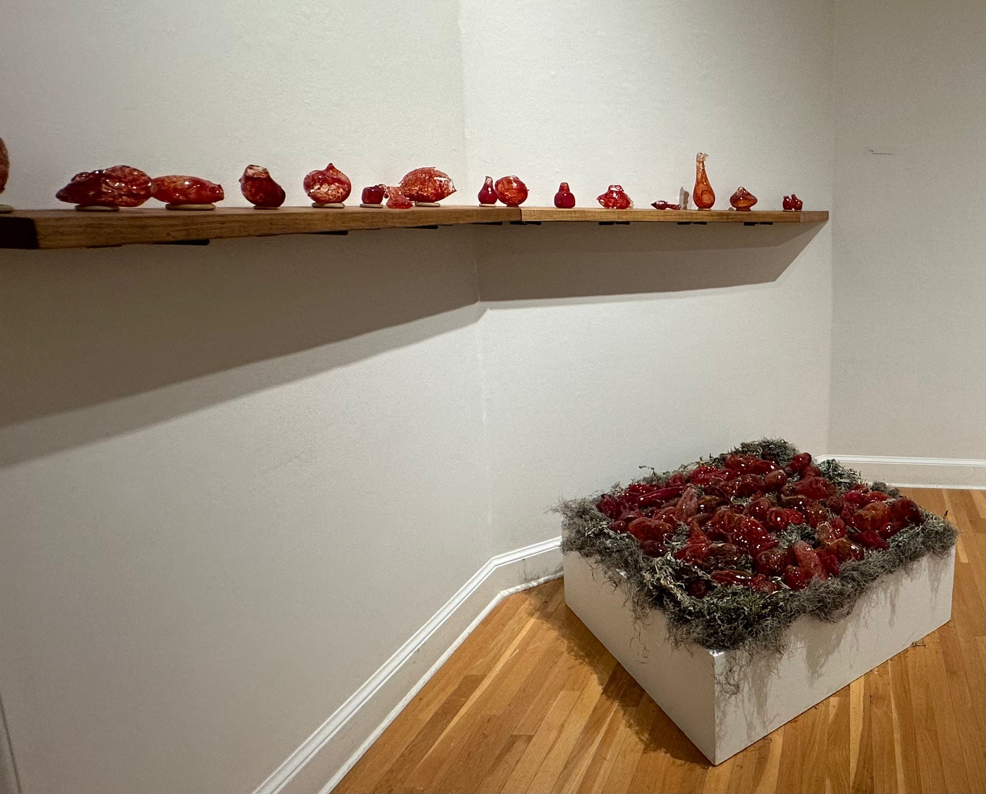 Carriage is a collection of 156 menstrual hued blown glass amphora piled up on Spanish moss, a traditional bedding material, and mugwort, an herb that induces vivid dreaming. When I make amphora I’m thinking about disposability, cosmetics, multiples; that which is transitory, like uteruses, unfertilized eggs, breath. The amphora evoke bottles for medicine, perfume, poison, makeup, remedies, oils, potions. They are surgical, sutured, fallopian tubes, boxes, shells, dendroids, clots, masses.