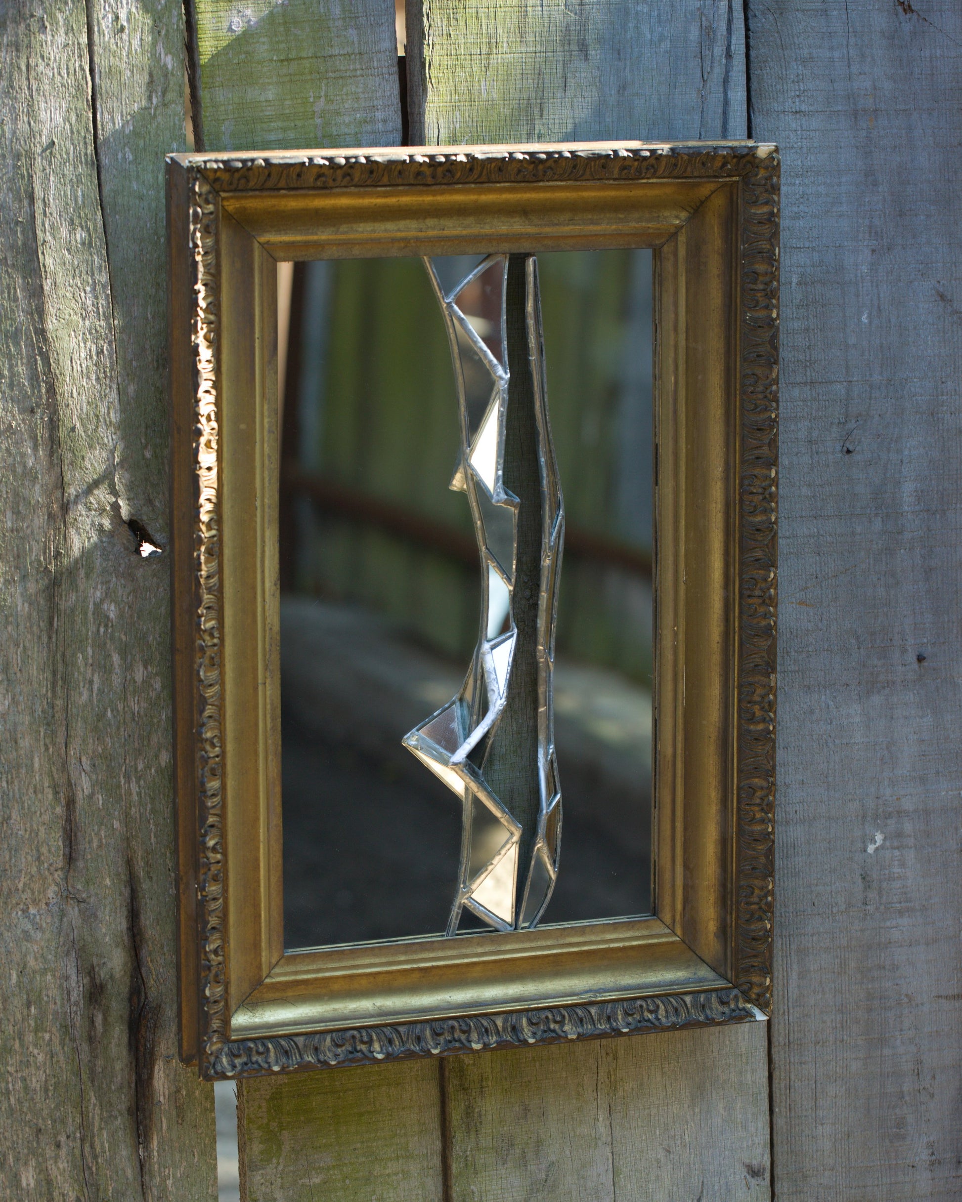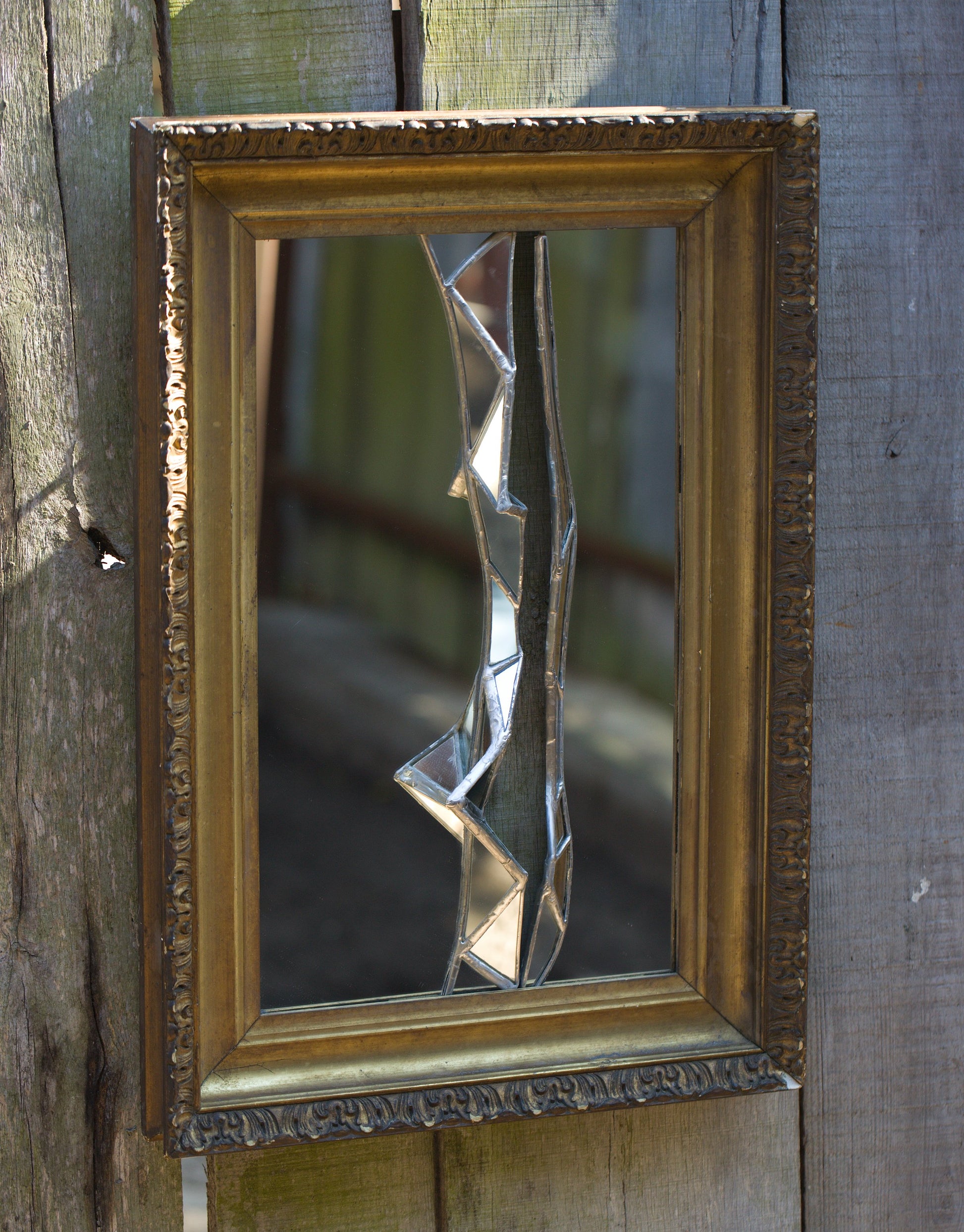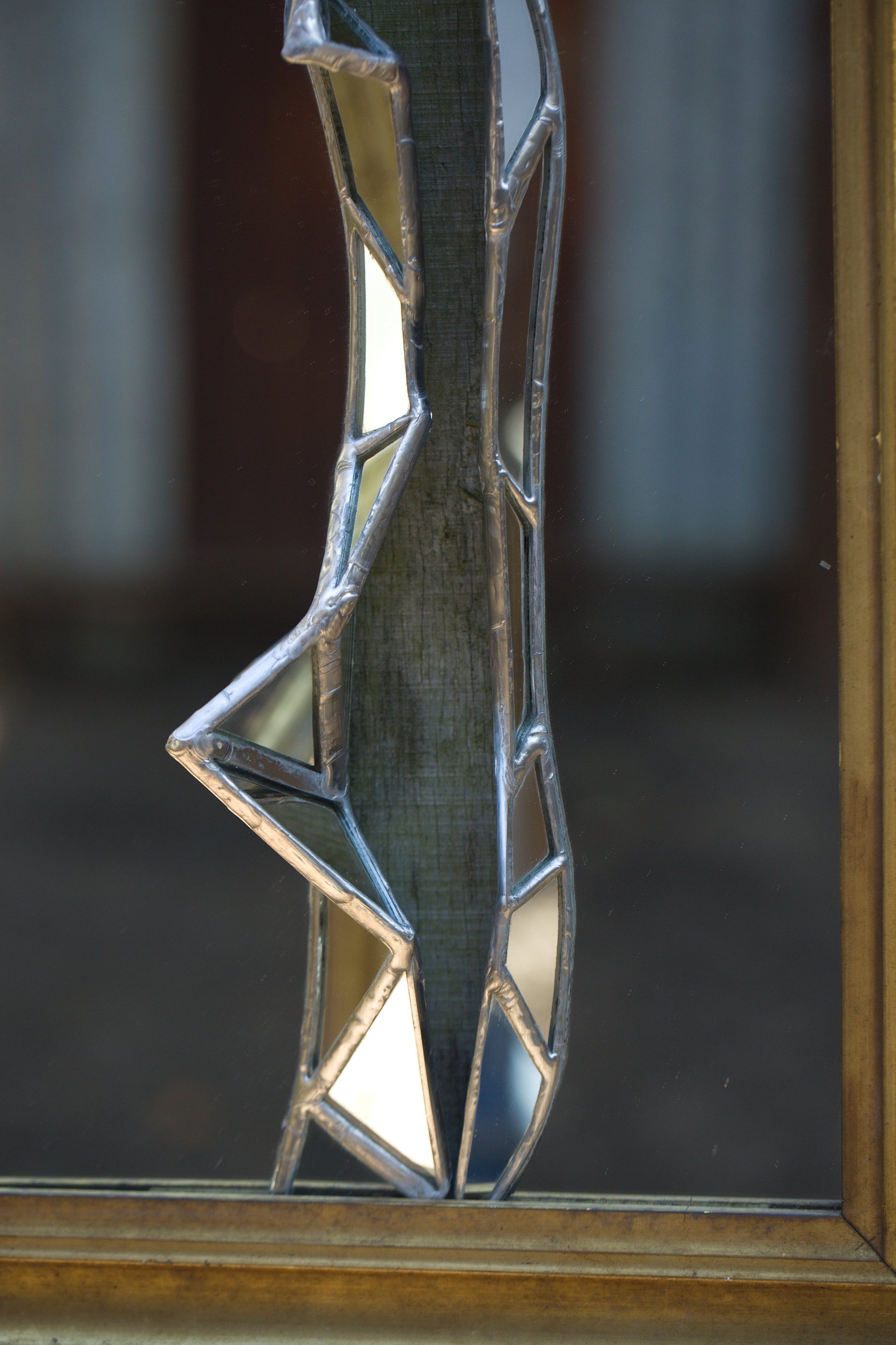 When I work with mirror, I find myself reflecting on perception; specifically, I am interested in the differences between the way we see ourselves, we want ourselves to be seen, we think we are seen, and how each other person sees us. The relationships between each of these ways of perceiving leave lots of gaps to jump with our imagination. This line of thought drives my sculptural mirror process. I do not make patterns when making work; I let myself find flow by creating a pallet of shapes and colors and arranging them like river stones.