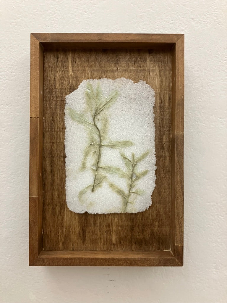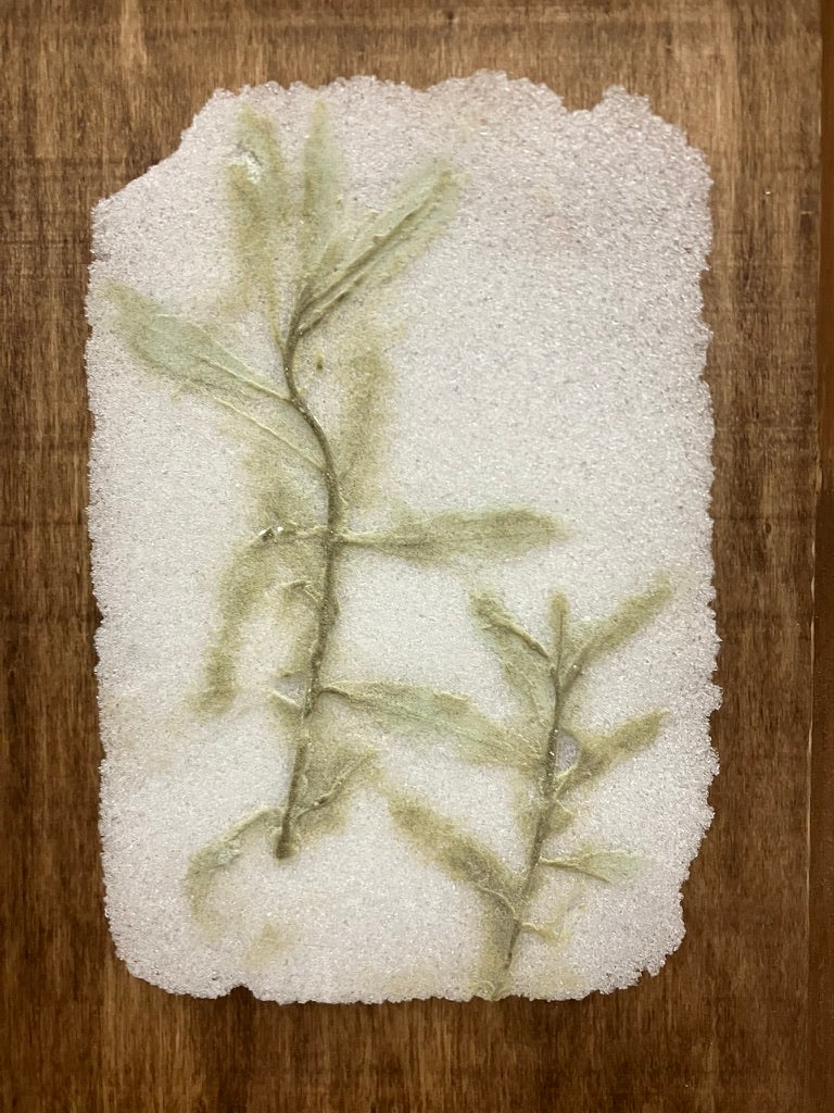 To make this glass print, tarragon was pressed into clay. A wax positive is made from the clay, and a plaster-silica mold is made from the wax. Glass powder was kiln-fused over the plaster-silica molds, then the glass ‘prints’ were manipulated while hot in the kiln, an expression of human agency and intervention.