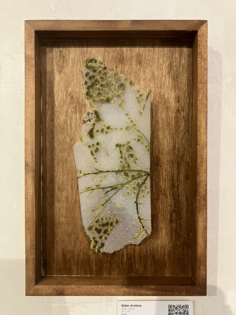 To make this glass print, elderberries were pressed into clay. A wax positive is made from the clay, and a plaster-silica mold is made from the wax. Glass powder was kiln-fused over the plaster-silica molds, then the glass ‘prints’ were manipulated while hot in the kiln, an expression of human agency and intervention.