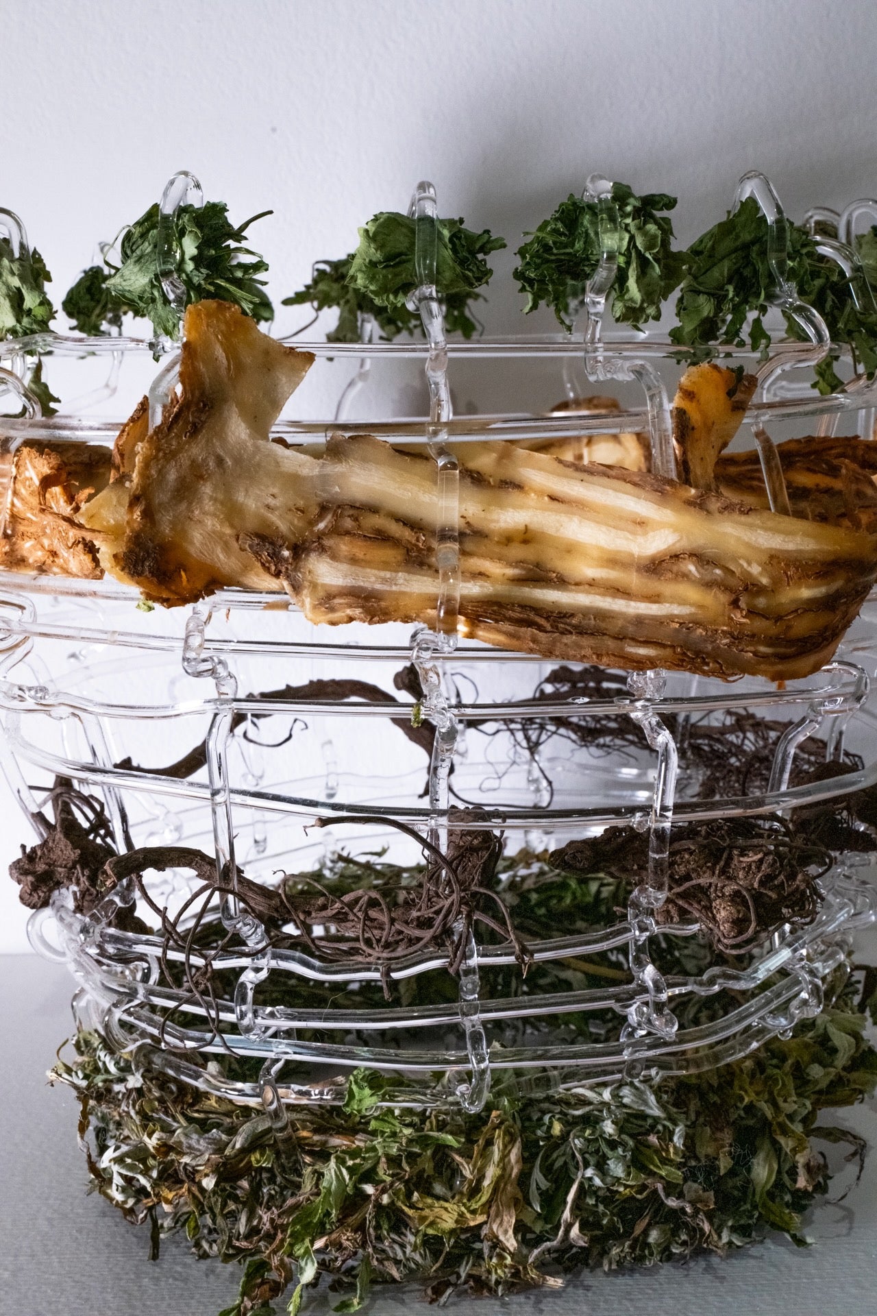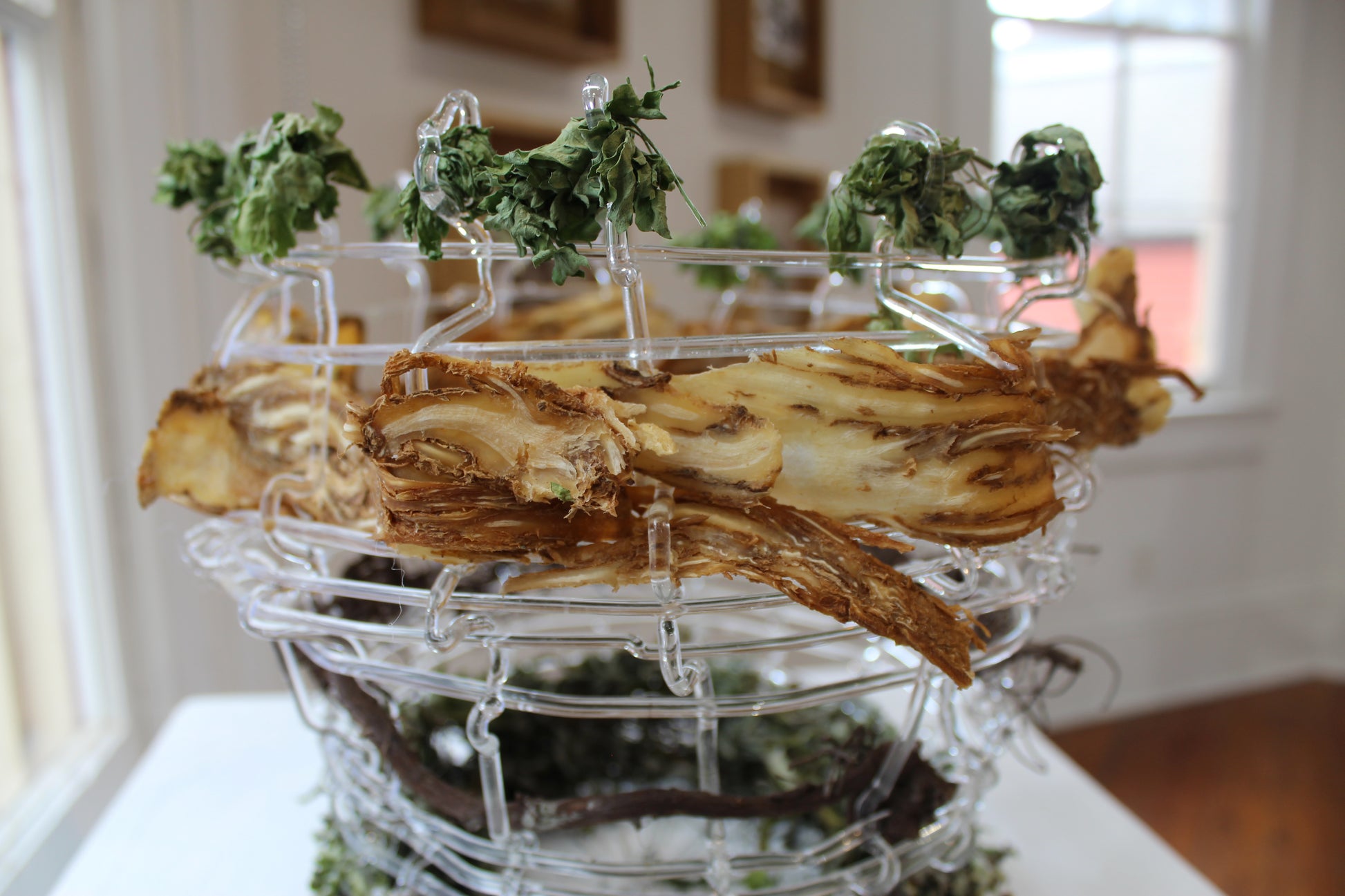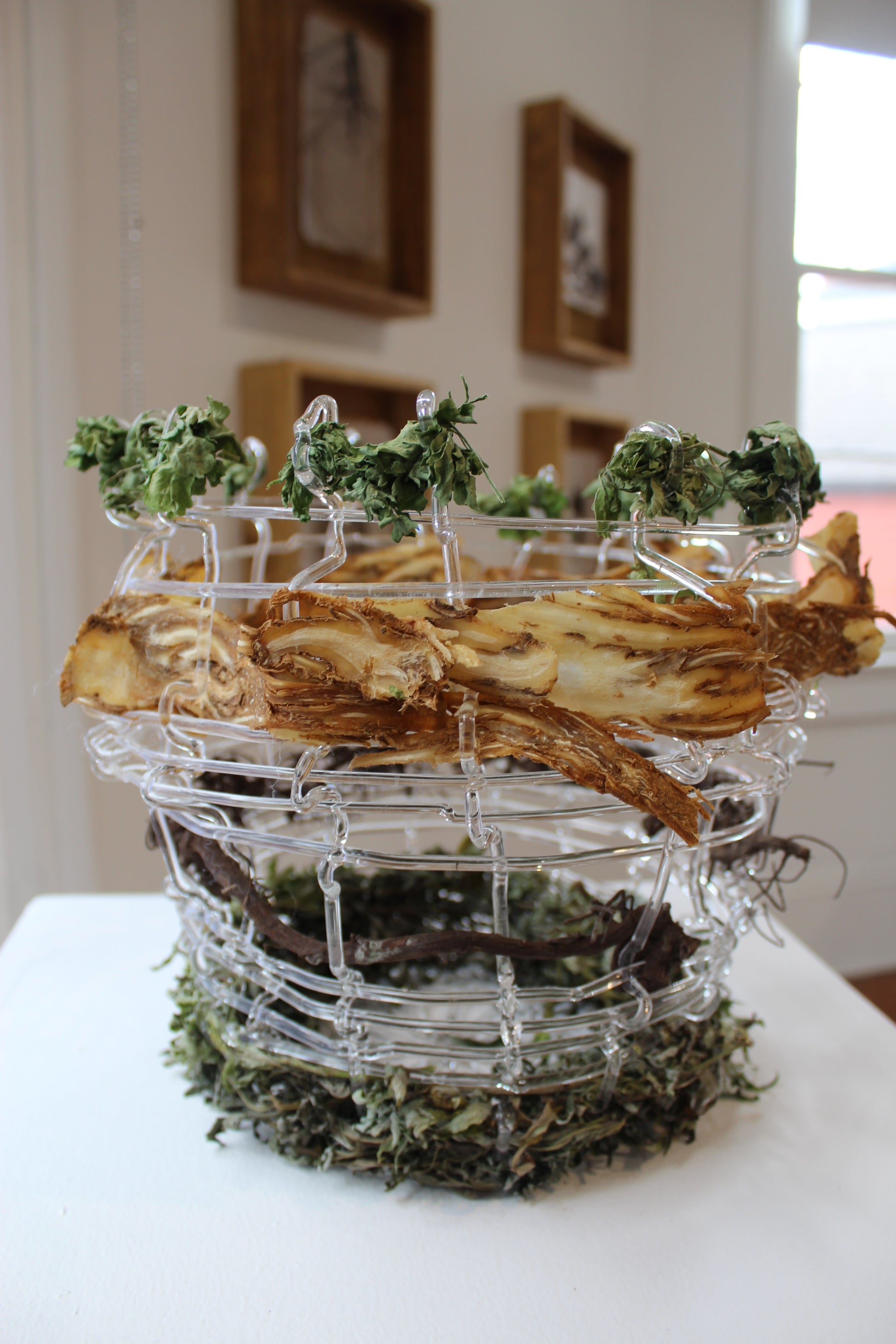This basket is an example of a flameworked borosilicate glass weaving technique I am in the process of developing. The plant material woven into this basket is from abortifacients used in the formulas recorded by my community partner’s research.