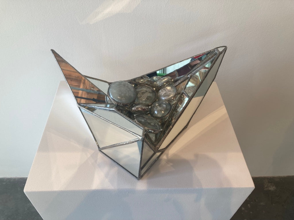 The Egyptian Ebers Papyrus, based on a 2500 BCE text, is the earliest known record of humans using plants to induce abortion. Globally throughout time humans have turned to plants as allies in making choices about their reproduction. “Eternal Choice” (2021) is a mirror vessel overflowing with abortifacient ‘seeds’ made of fresh plants fused in glass. These plants have been used since ancient times as reproductive ‘choices’ and are common in the Gulf South today. The use of mirror evokes self and society in abortion history.