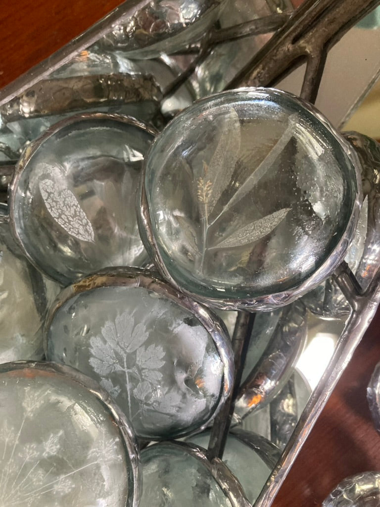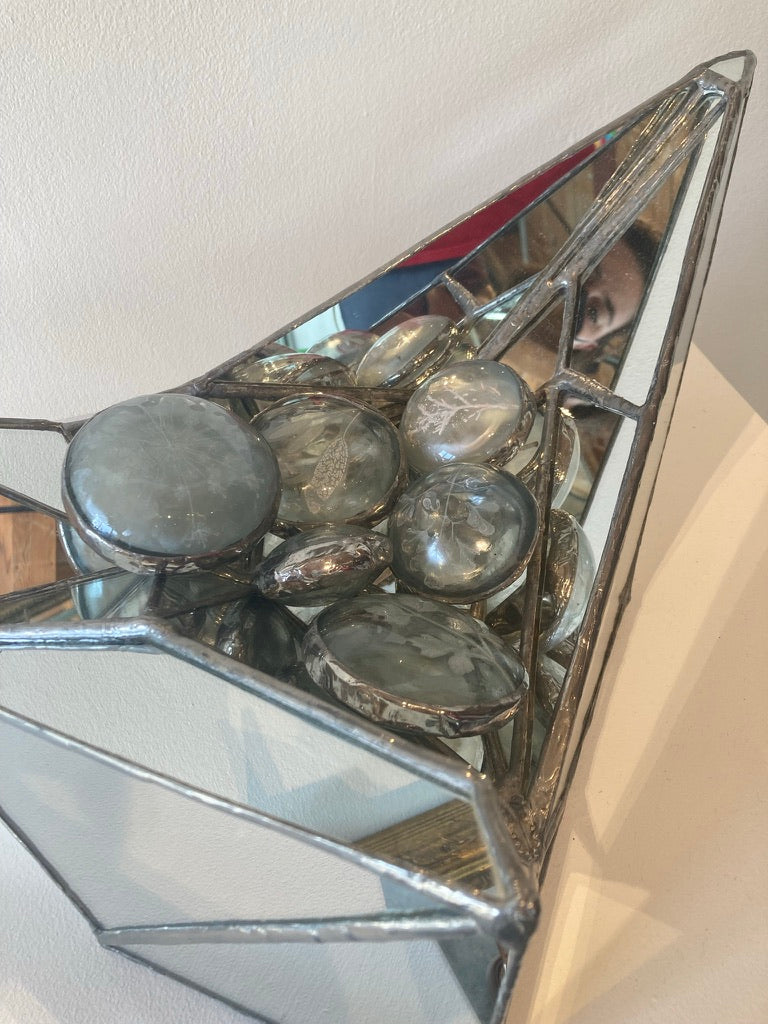 Glass and metal sculpture: mirror, copper foil, 60/40 solder, common plants used as abortifacients since ancient times fused and slumped in float glass.