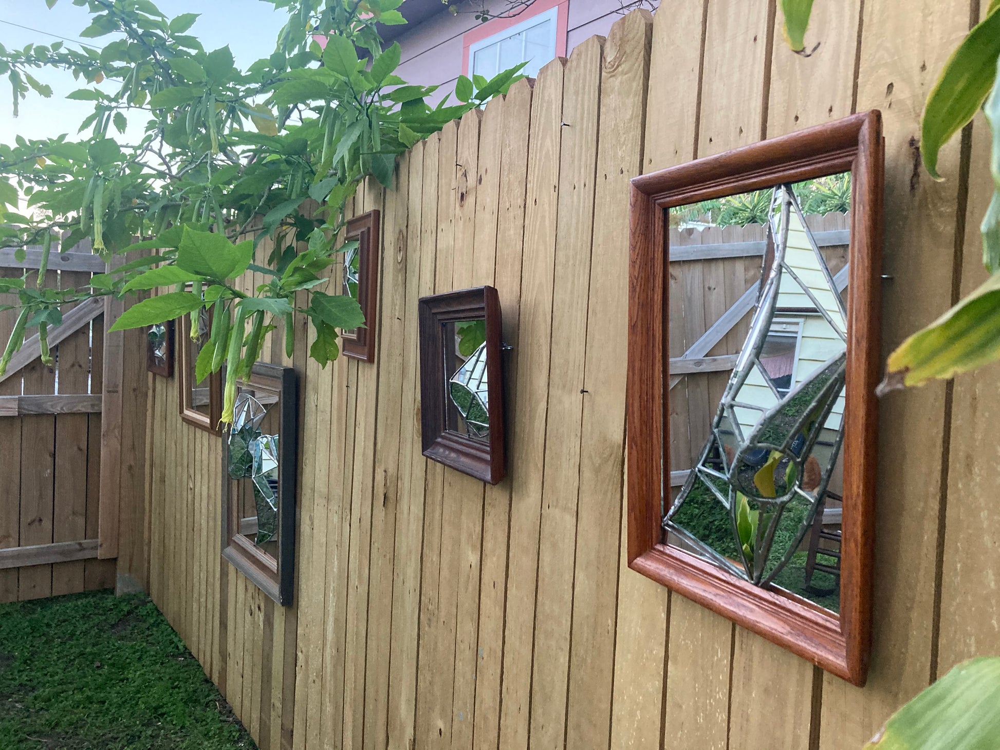 Always when I work with mirror, I find myself reflecting on perception; specifically, I am interested in the differences between the way we see ourselves, we want ourselves to be seen, we think we are seen, and how each other person sees us. The relationships between each of these ways of perceiving leave lots of gaps to jump with our imagination. This line of thought drives my sculptural mirror process. I do not make patterns when making work; I let myself find flow by creating a pallet of shapes and colors and arranging them like river stones.