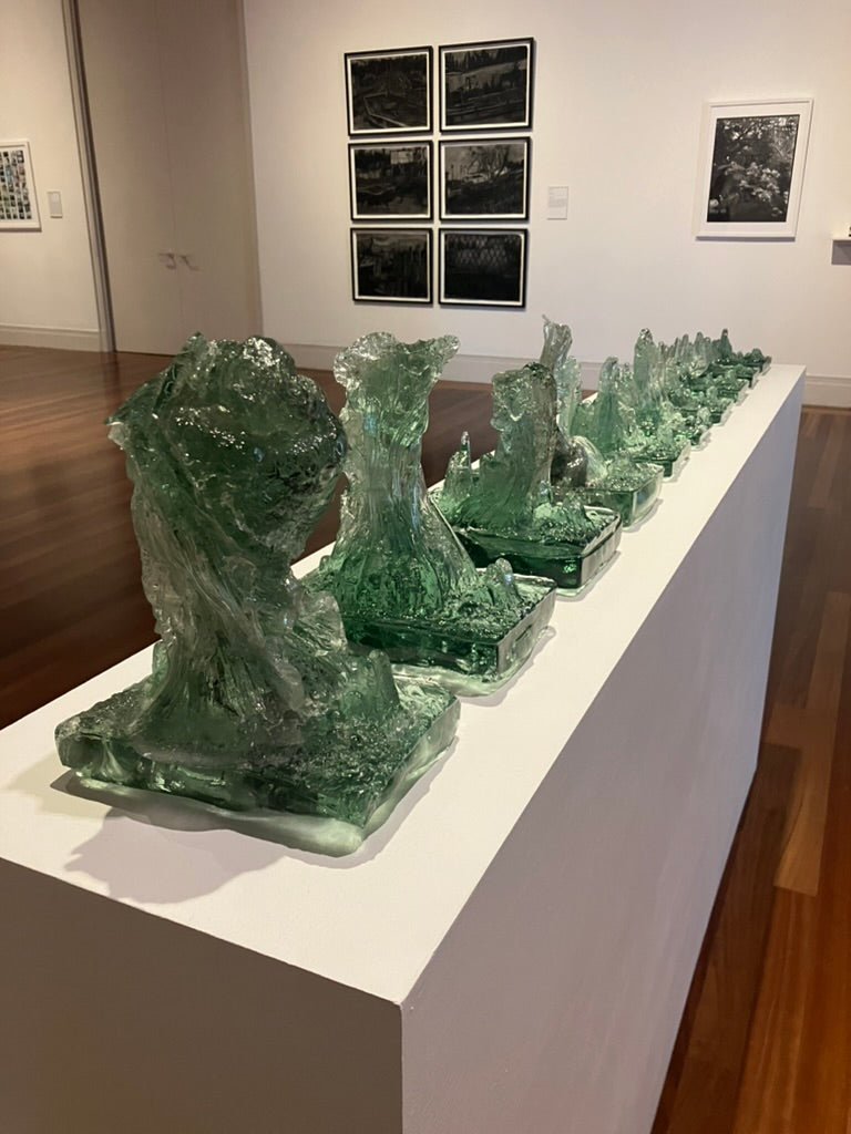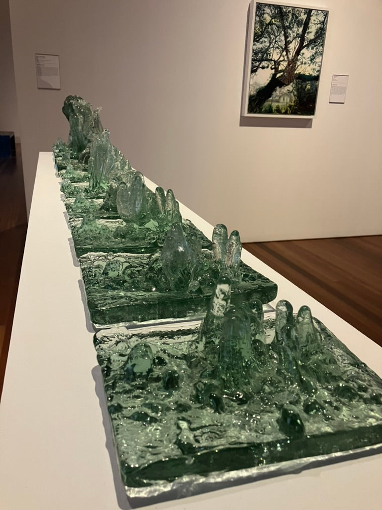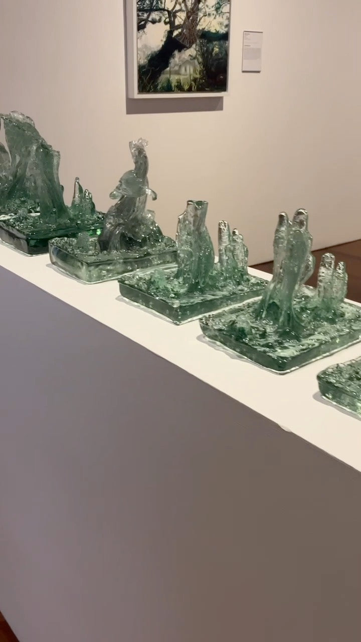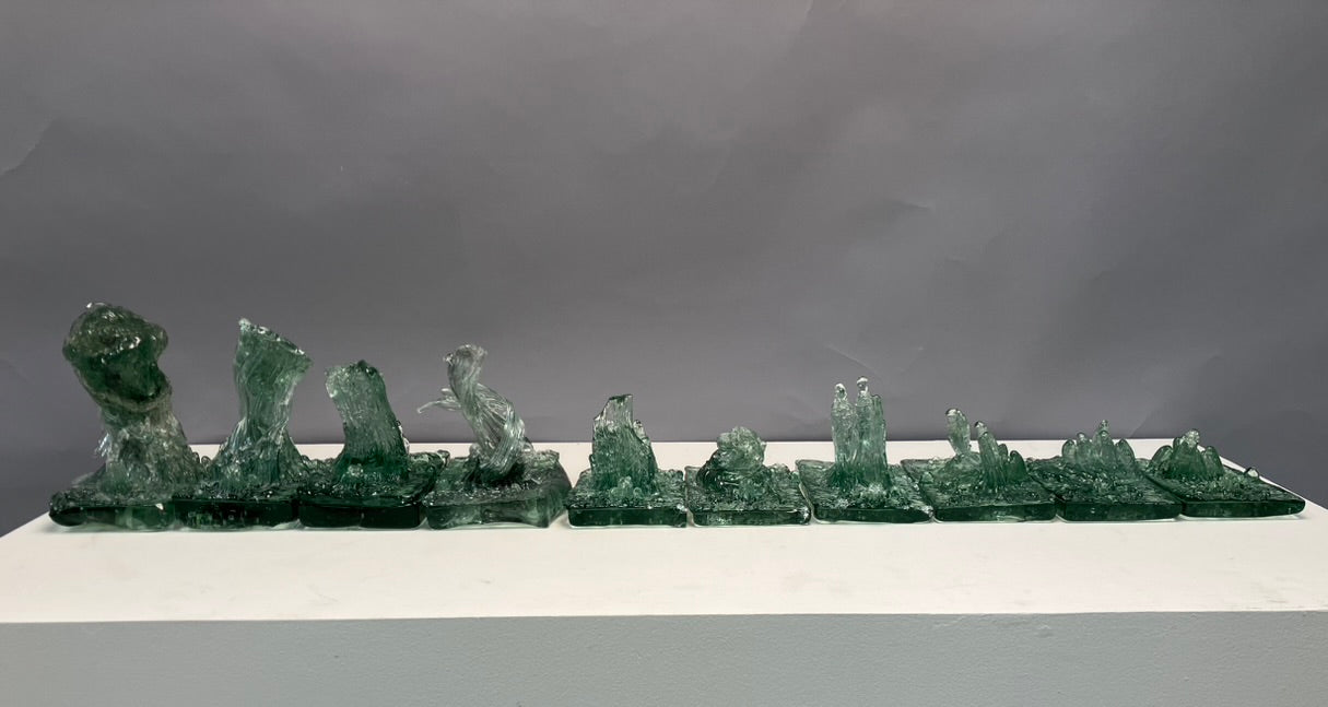 Listen to the Old Growth is a series of monoprints, the result of repeatedly hot casting recycled bottle glass over a cross cut slab of cypress. As the heat of the glass imprinted the wood, the glass took on the form of the tree’s landscape and became an archive of its story. We live in a time of anthropocene crisis; humans, however, do not impact our environment more than it impacts us, it is a false binary to see ourselves as separate from nature. Hope lies in the remembering of evolution’s persistence.
