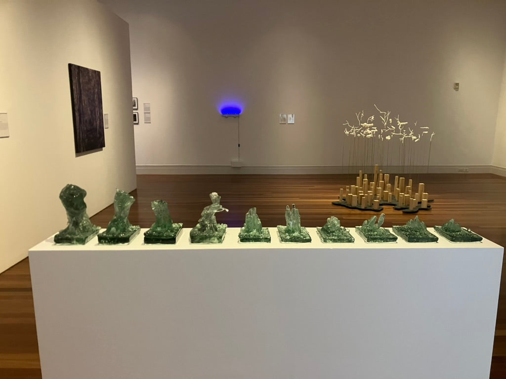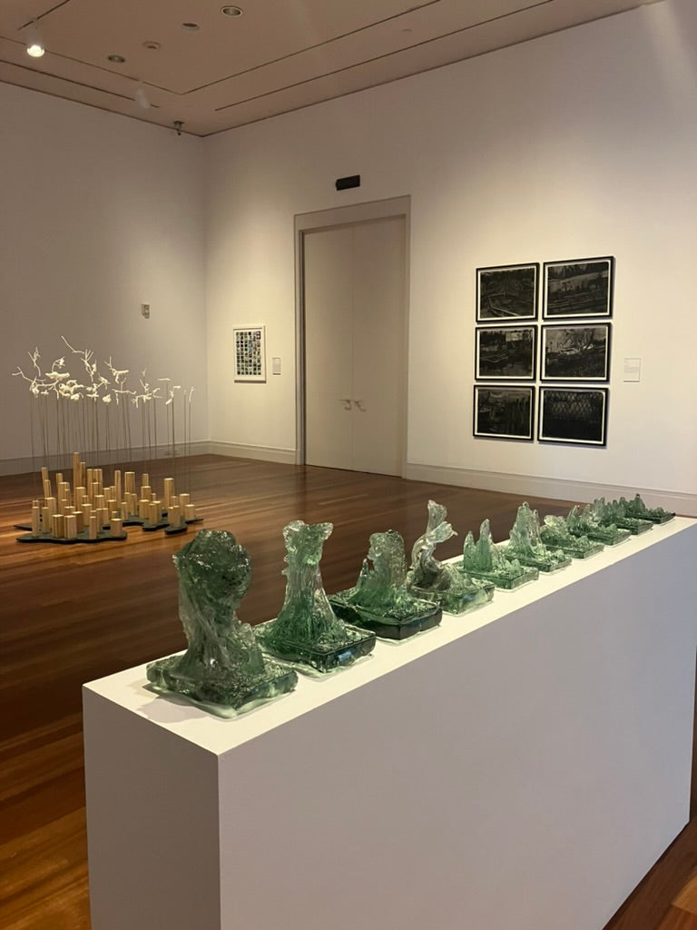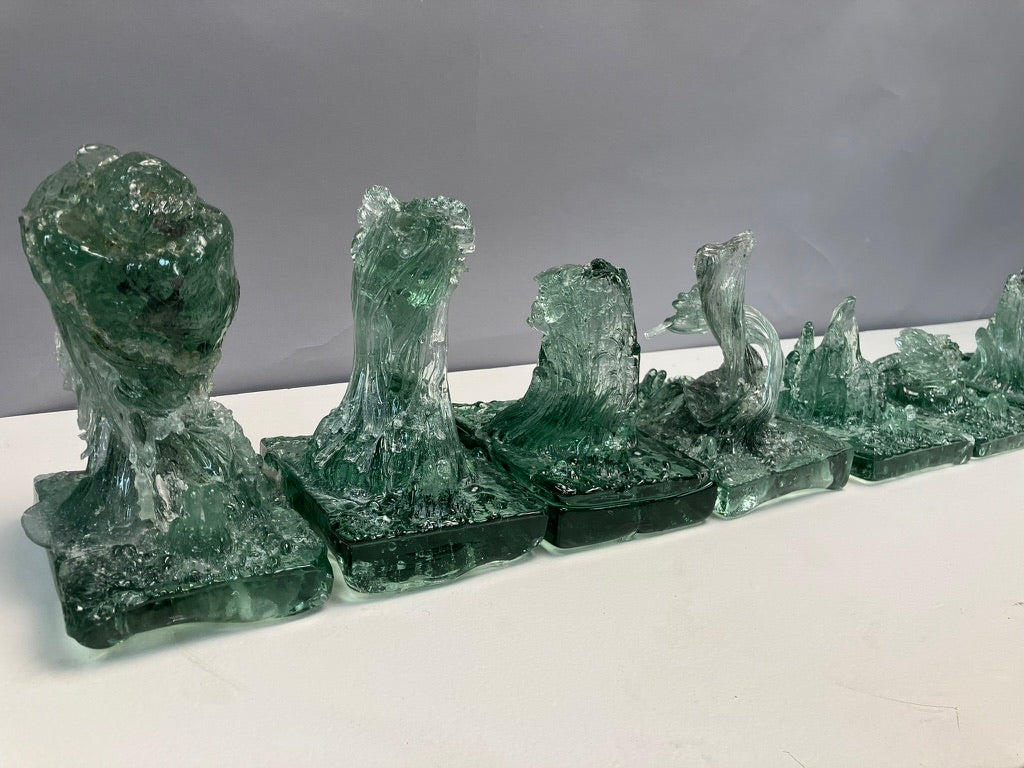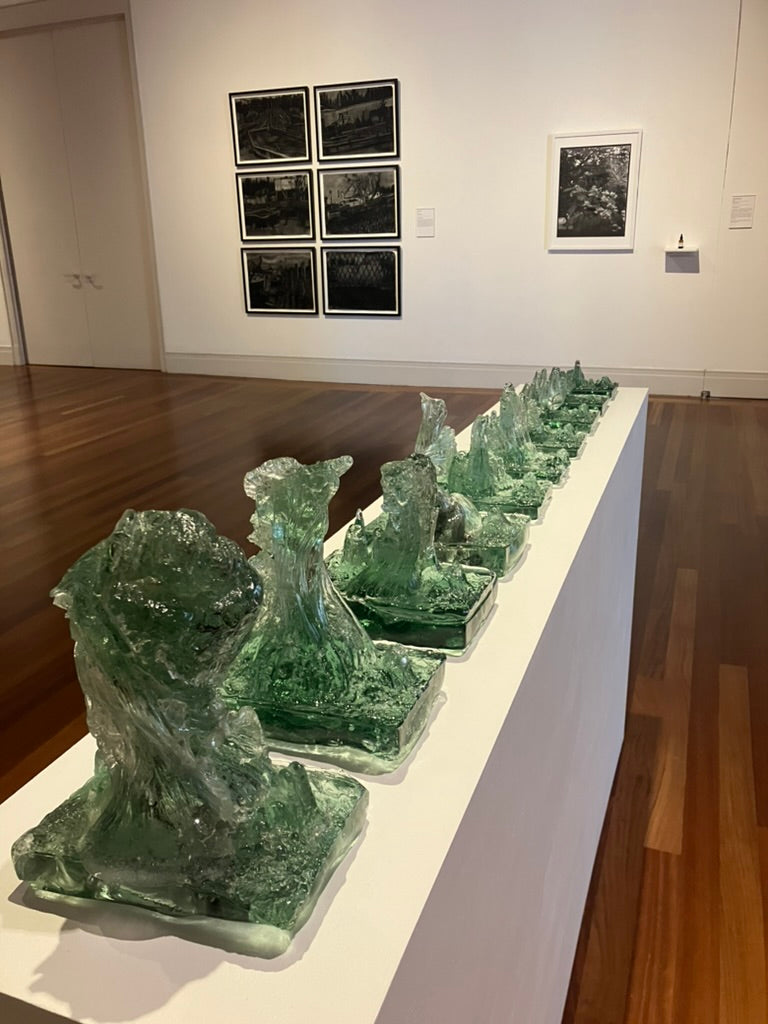 Listen to the Old Growth is a series of monoprints, the result of repeatedly hot casting recycled bottle glass over a cross cut slab of cypress. As the heat of the glass imprinted the wood, the glass took on the form of the tree’s landscape and became an archive of its story. We live in a time of anthropocene crisis; humans, however, do not impact our environment more than it impacts us, it is a false binary to see ourselves as separate from nature. Hope lies in the remembering of evolution’s persistence.