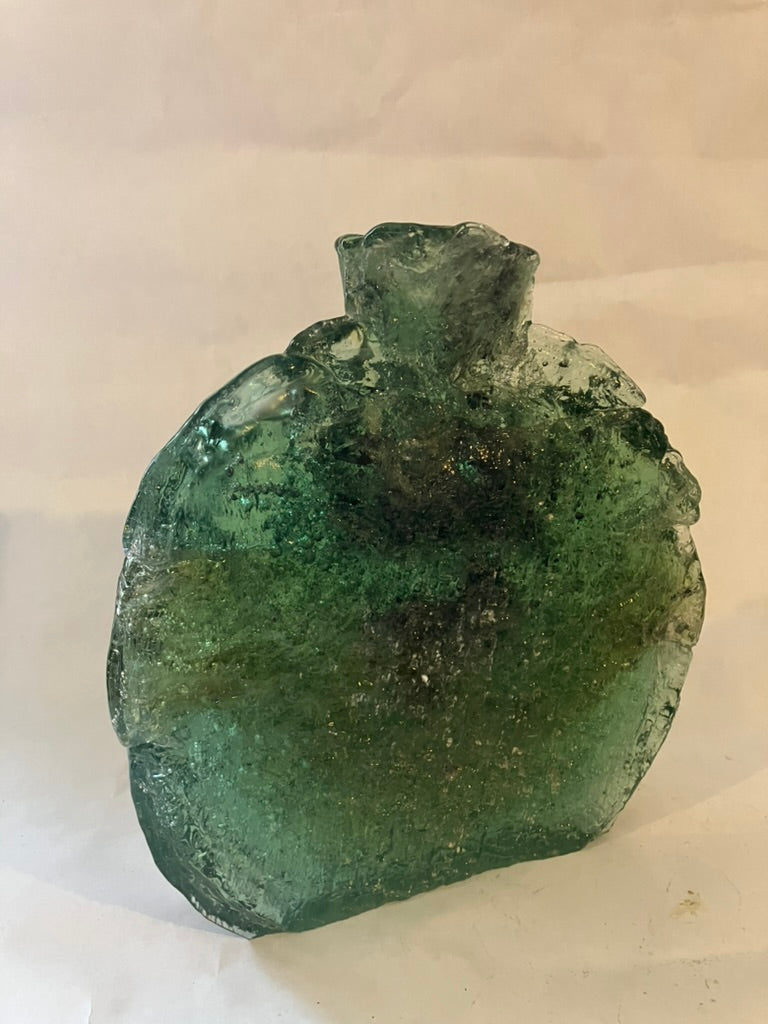This casting is part of the ‘mothermold series’— all of which were made by pouring molten glass into the same two-part wooden mold, then opening the mold and manipulating the glass while still hot to create the shapes.