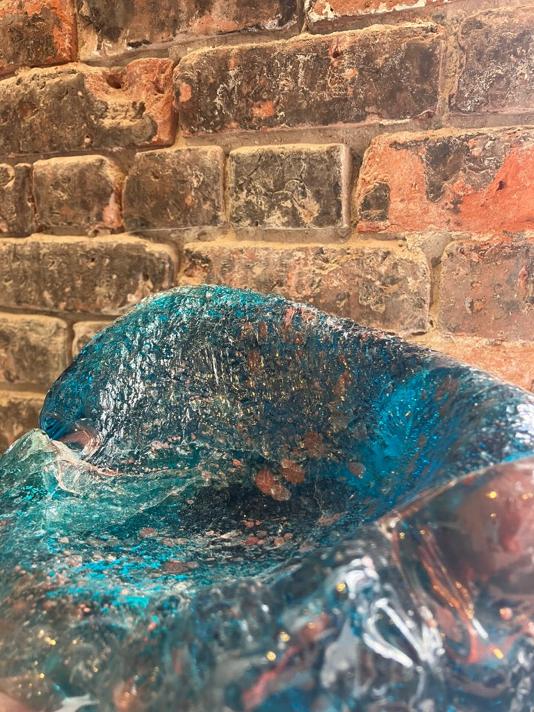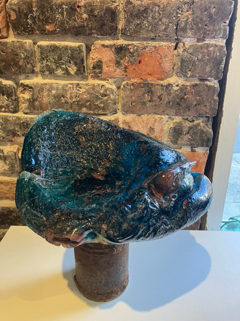 This casting is part of the ‘mothermold series’— all of which were made by pouring molten glass into the same two-part wooden mold, then opening the mold and manipulating the glass while still hot to create the shapes.