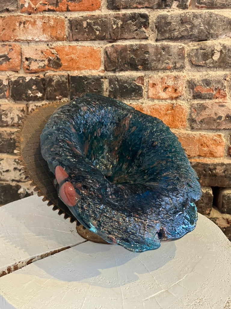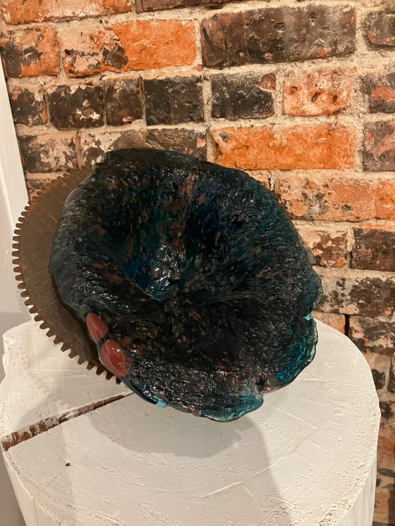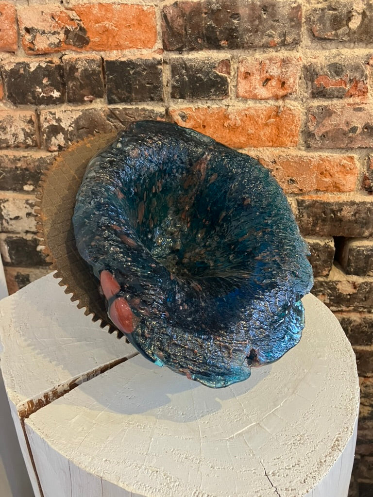 This casting is part of the ‘mothermold series’— all of which were made by pouring molten glass into the same two-part wooden mold, then opening the mold and manipulating the glass while still hot to create the shapes.