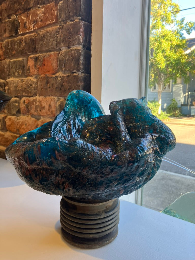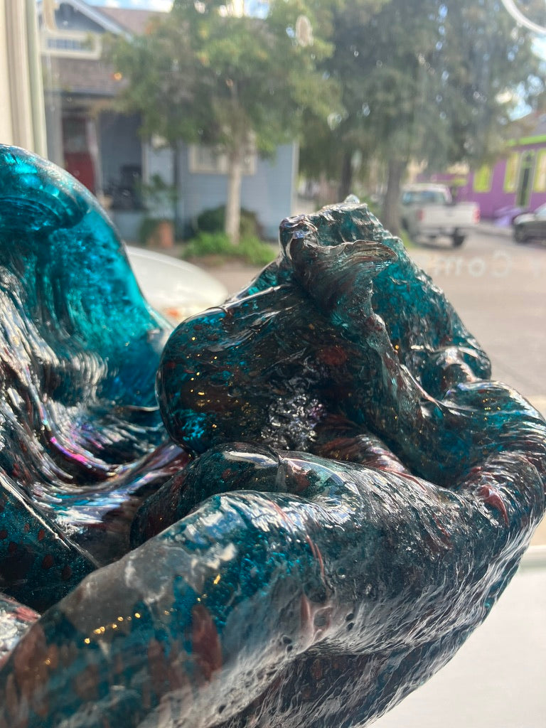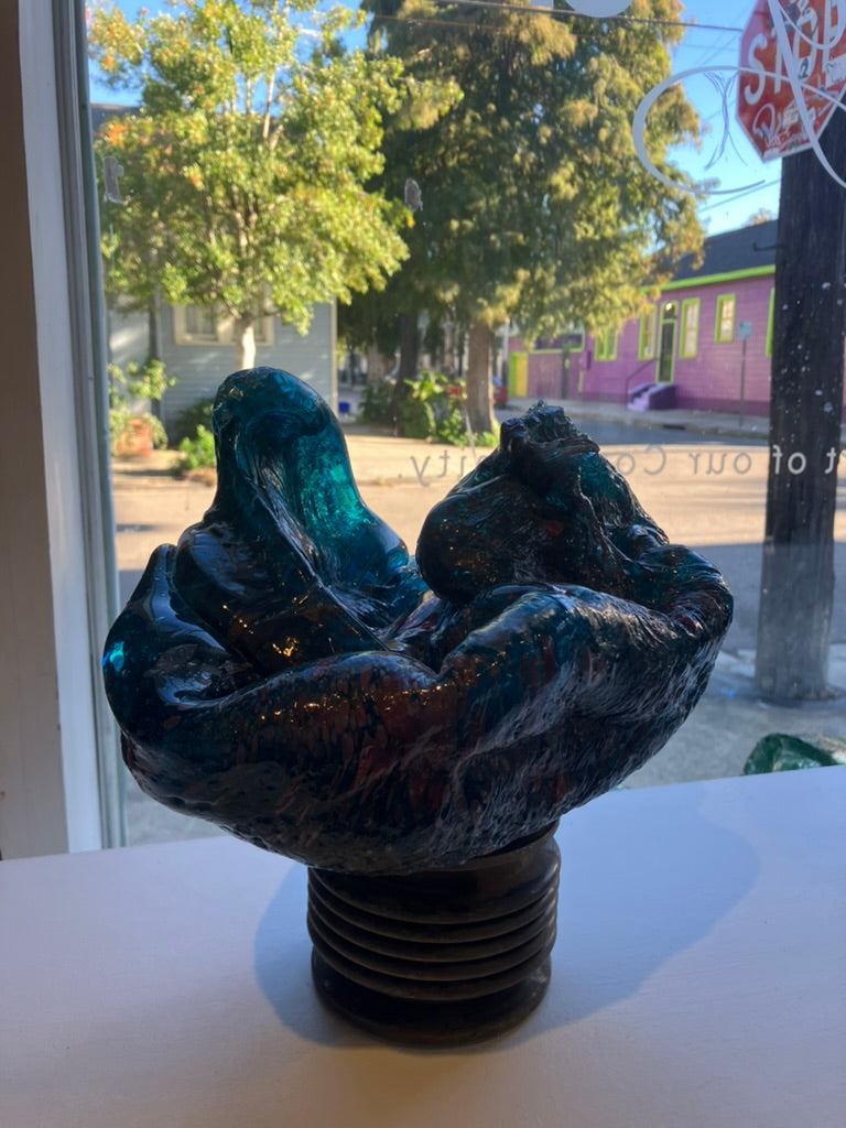 This casting is part of the ‘mothermold series’— all of which were made by pouring molten glass into the same two-part wooden mold, then opening the mold and manipulating the glass while still hot to create the shapes.