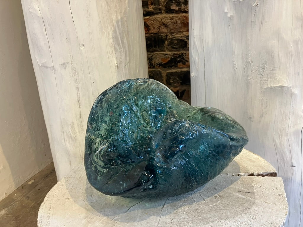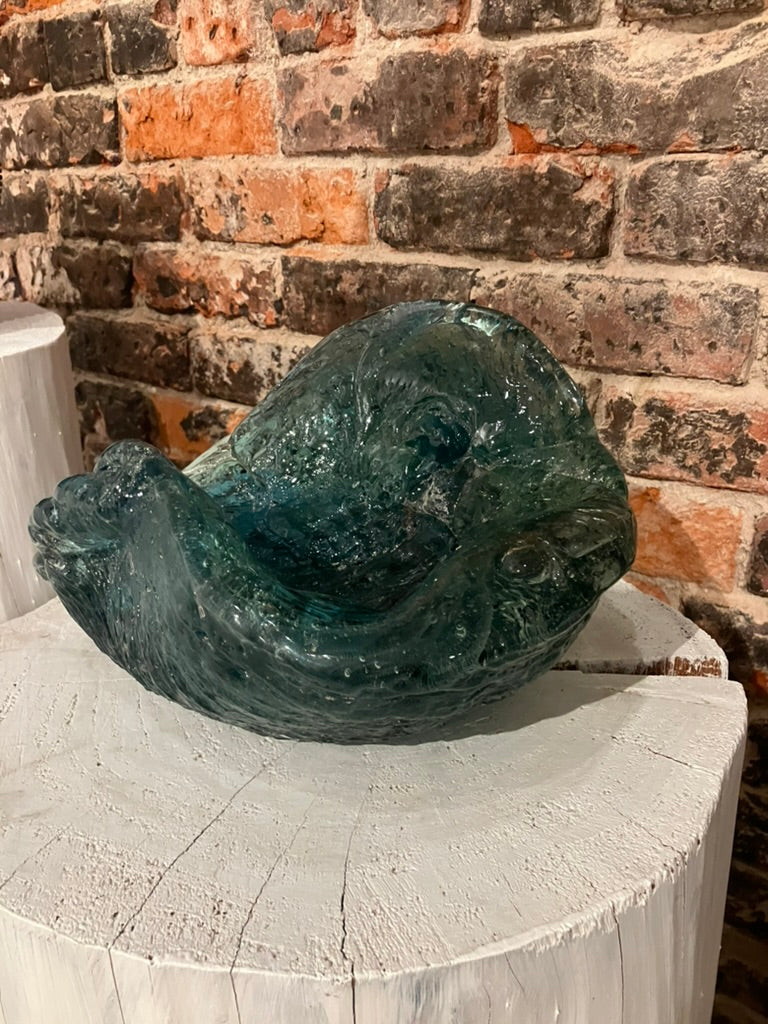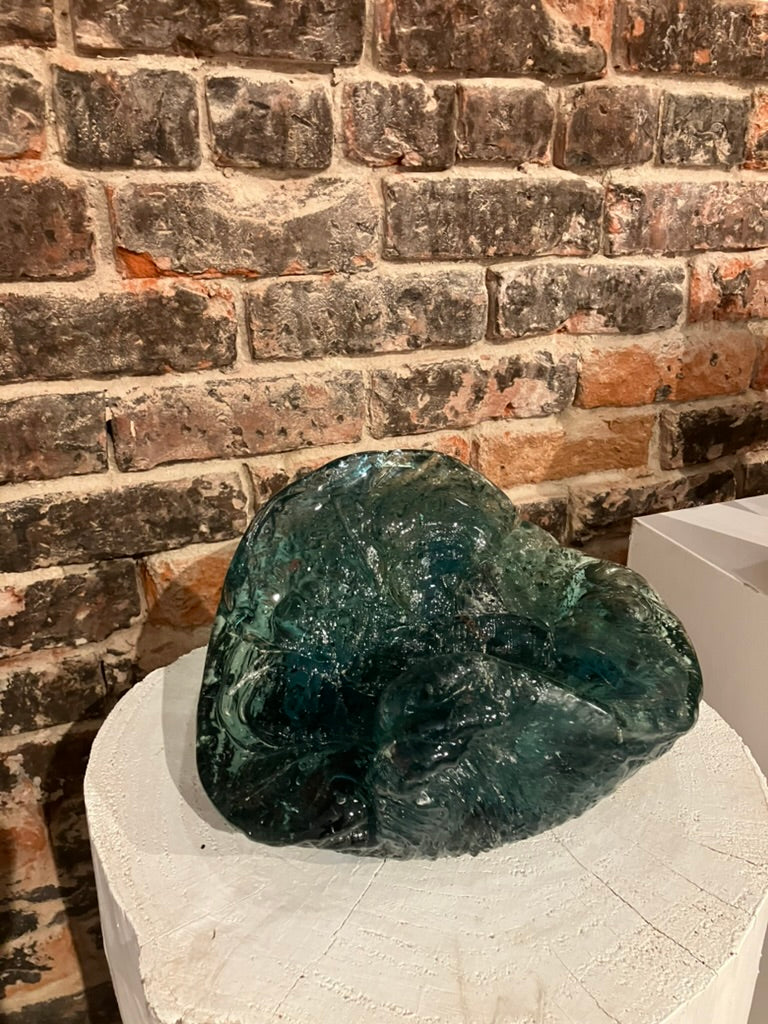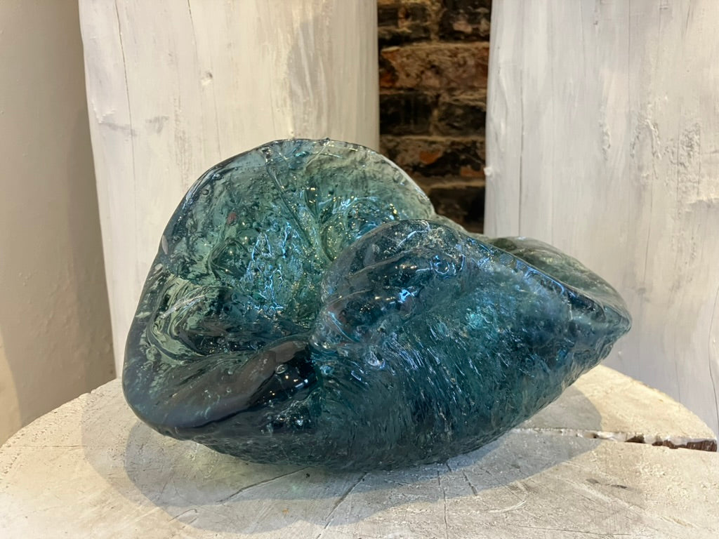 This casting is part of the ‘mothermold series’— all of which were made by pouring molten glass into the same two-part wooden mold, then opening the mold and manipulating the glass while still hot to create the shapes.