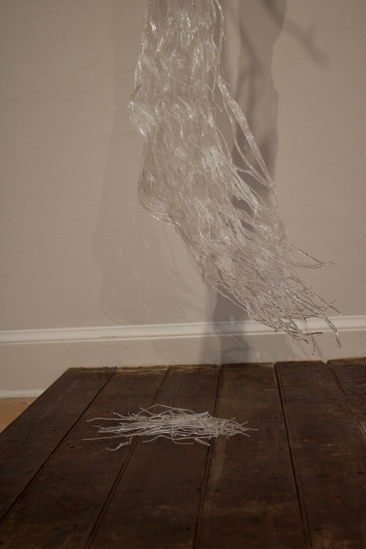 Ceremonial brooms prompt the consideration: what will this object cleanse? The vulnerable bristles are mid-sweep, static evidence of agency. The shadows cast are striking– evidence of unseen labor. The glass is clear, a glinting prism of all color; the fibrous tendrils both cast and cleanse its own woven shadows.