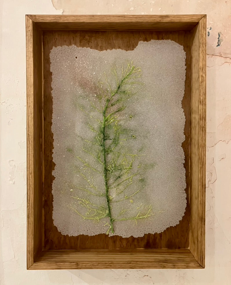Mugwort is an ally of human reproductive agency. To make this glass print, Mugwort was pressed into clay. A wax positive is made from the clay, and a plaster-silica mold is made from the wax. Glass powder was kiln-fused over the plaster-silica molds, then the glass ‘prints’ were manipulated while hot in the kiln, an expression of human agency and intervention.