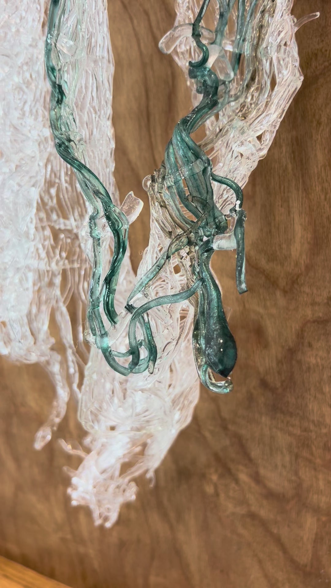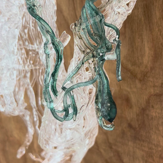Weaving glass, as with any fibers, is a labor of love. The formation of this piece is the result of hours of pulling cane, and more than twelve kiln firings.