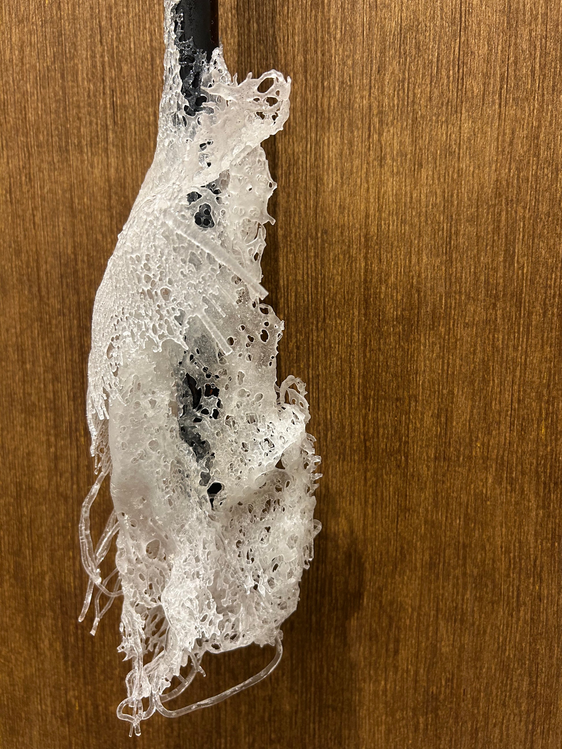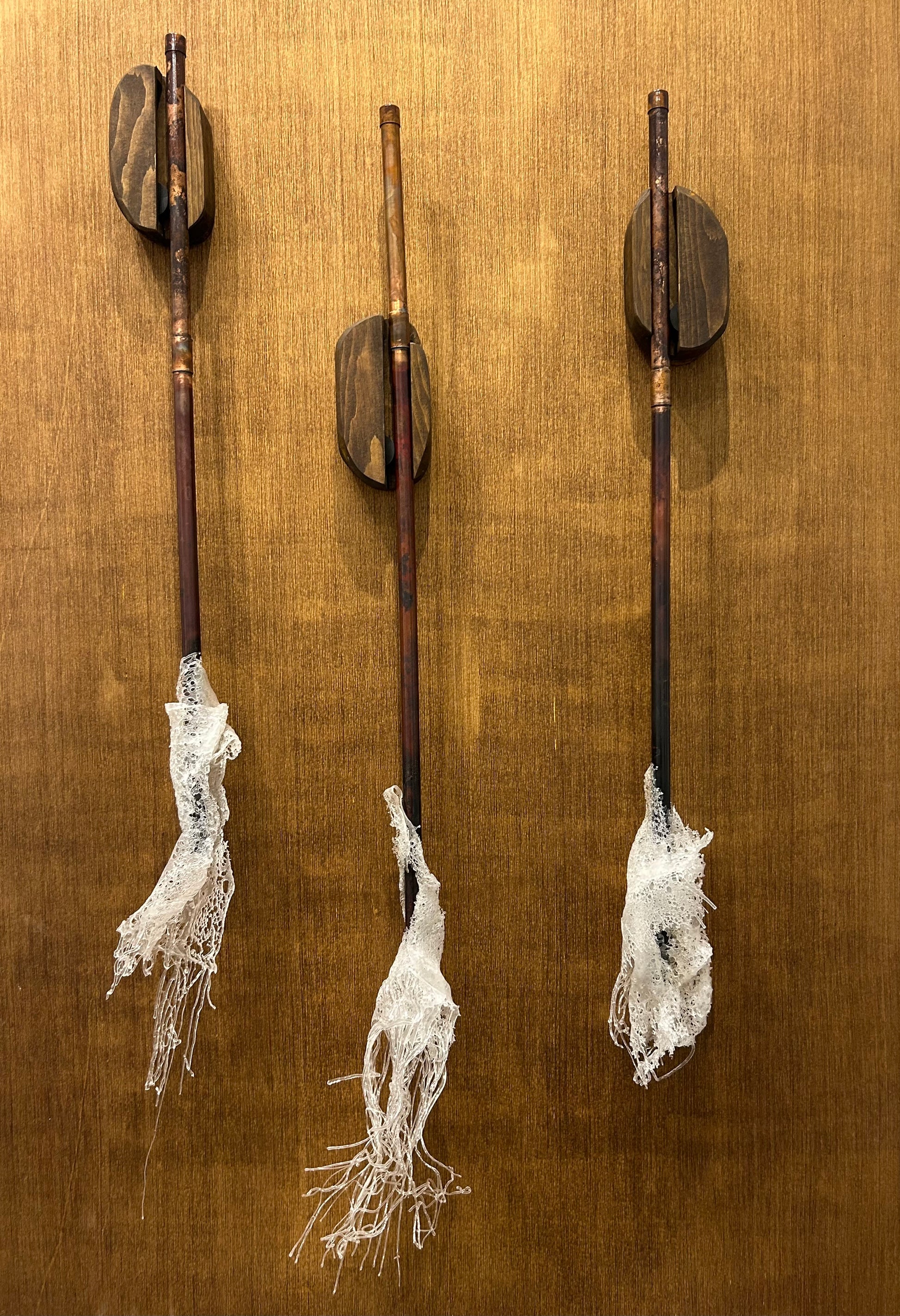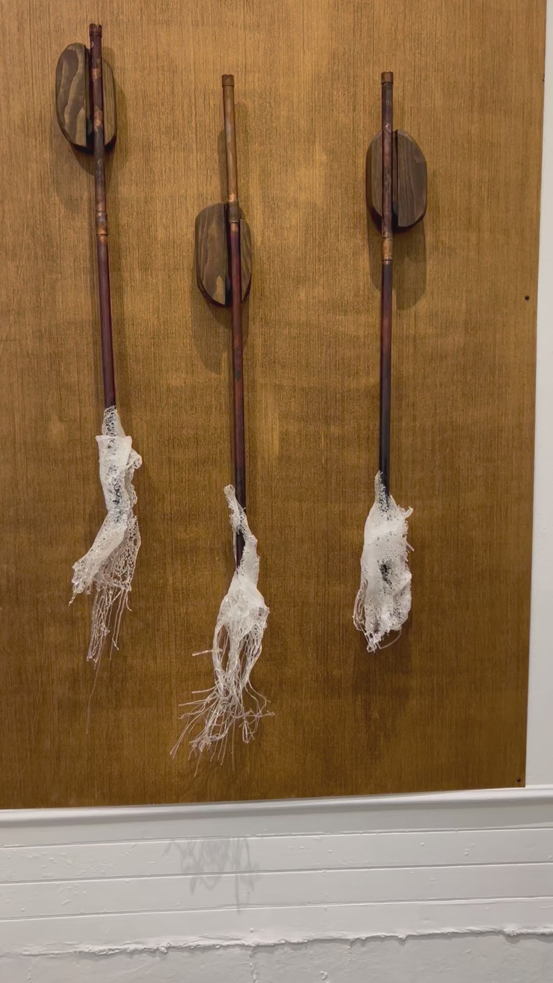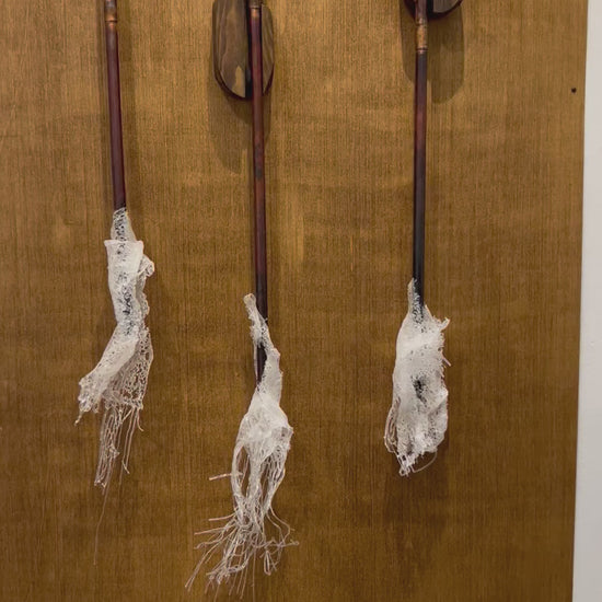A set of three 'classic' besom forms made of glass with copper handles. The holders for these brooms are inspired by Amish broom holder design. To create these forms, I hand pulled cane (the bristles) and made glass powder. I sifted the powder onto a zircar kiln shelf and fired it in the kiln repeatedly until I got the texture I liked, then fused the cane to the edges of thin glass sheet. I then added the copper tube to the next firing and when it was at 1330 F I opened the kiln and manipulated the glass around the bottom of the copper tube to get the form I desired.
