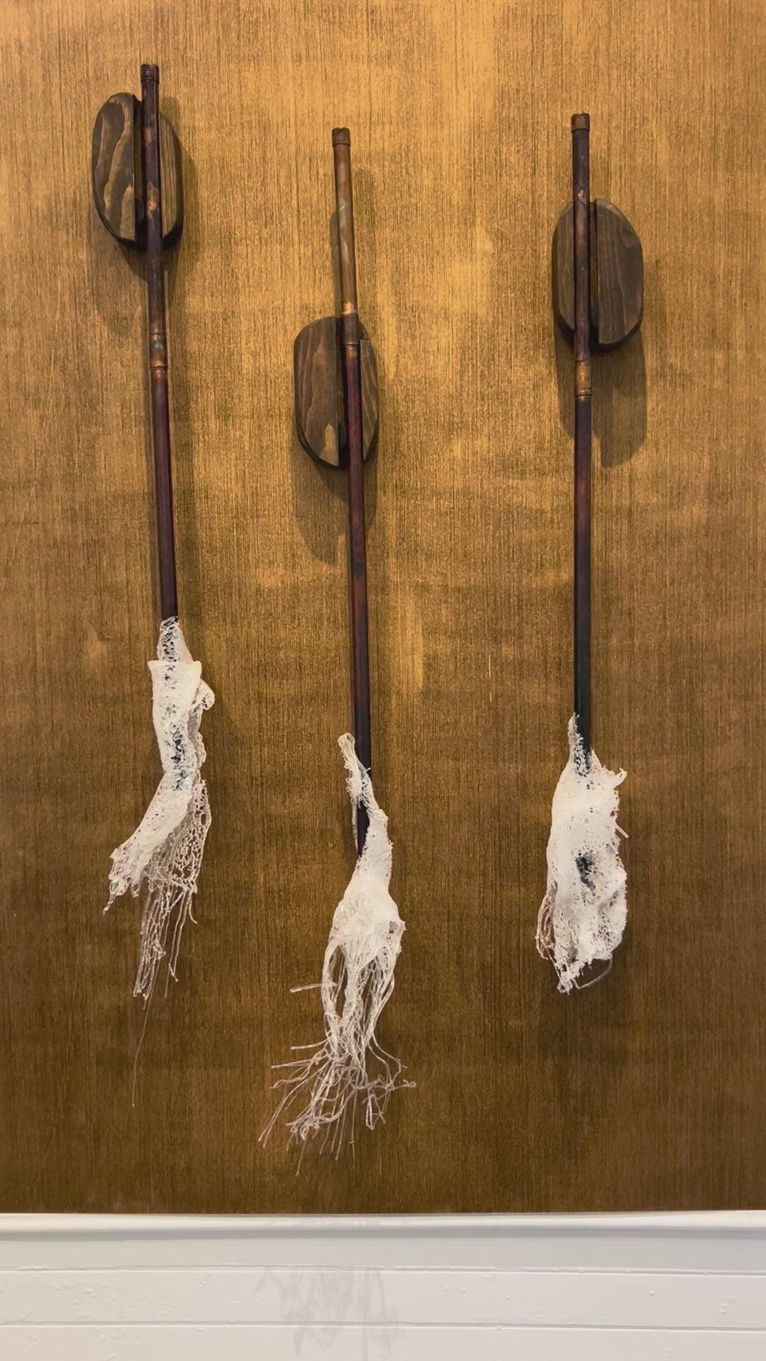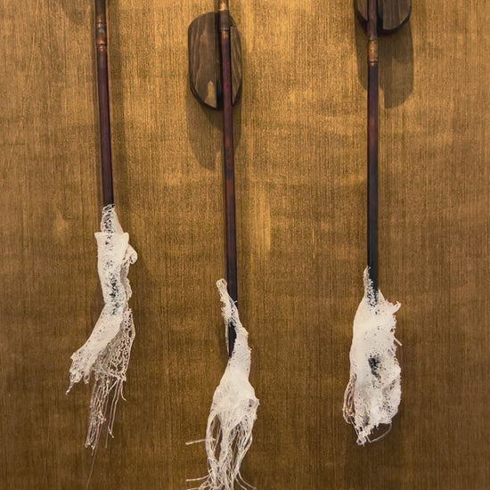 This set of three glass brooms is inspired by traditional witches besoms. Their fragility demonstrates optimism; their wear is the result of domestic meditation.